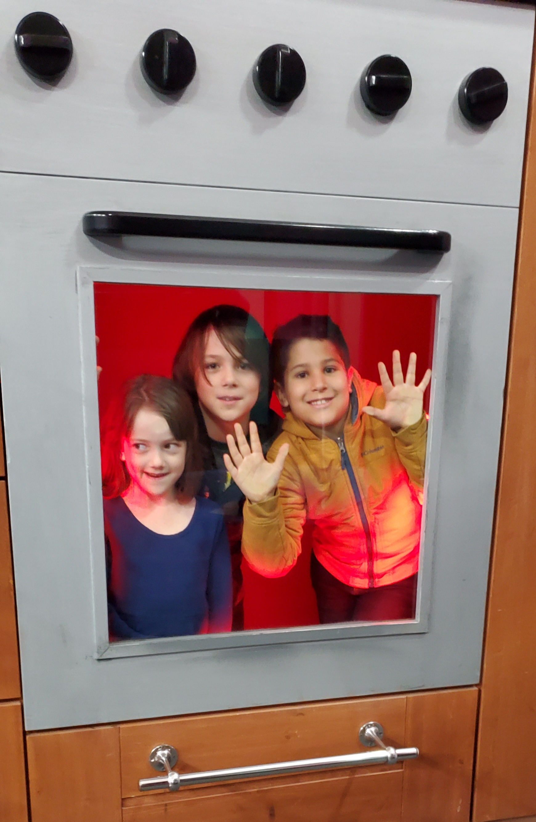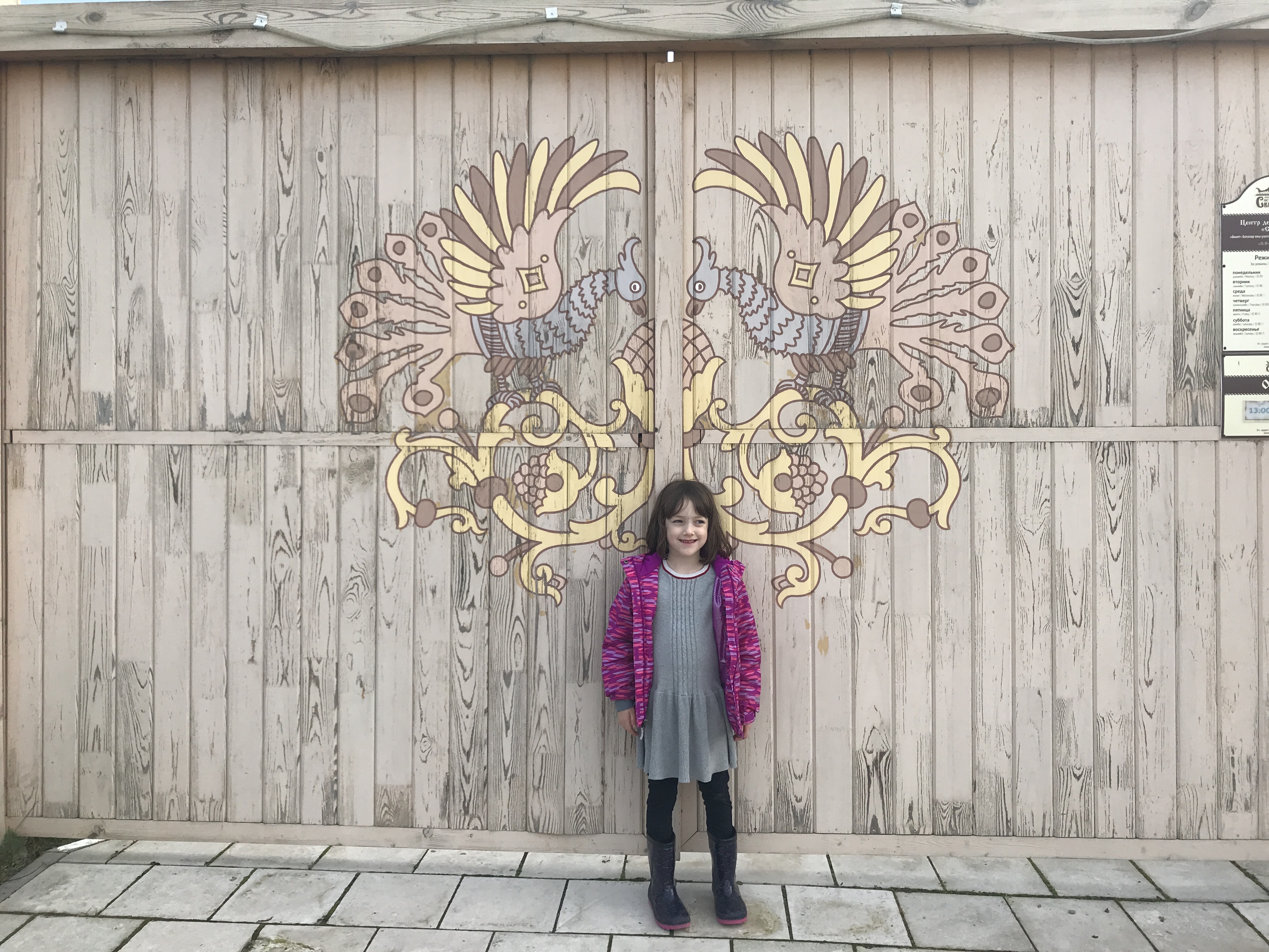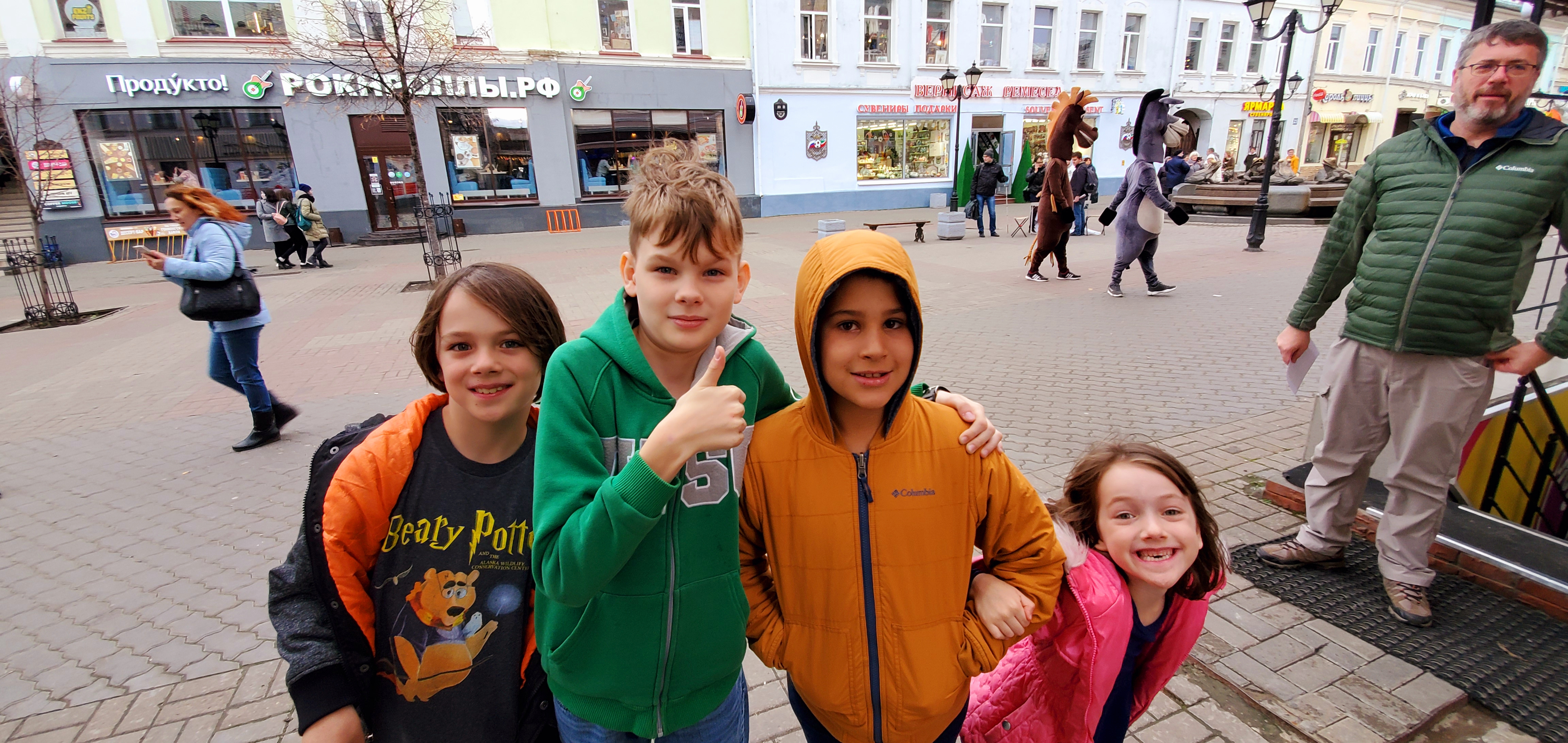 Simon and I took the three older cousins and their buddy for a walk down Baumann street to visit the various tourist traps that are part of the “Big Funny” universe. We began at the mirror maze, in which the kids donned plastic gloves and unsuccessfully attempted to navigate through the maze. We moved on to the next location where Mila and Noah opted for the “plate breaking for stress relief” activity and Alden and his friend decided to go to the prison escape. If you can’t read the Cyrillic in the mugshot, Alden’s crime was not letting his parents rest and his friend’s crime was coming home late. Then they all explored the upside down house. At our last stop, they took selfies and other shots of each other as they explored the giant’s house and the interactive painting rooms.