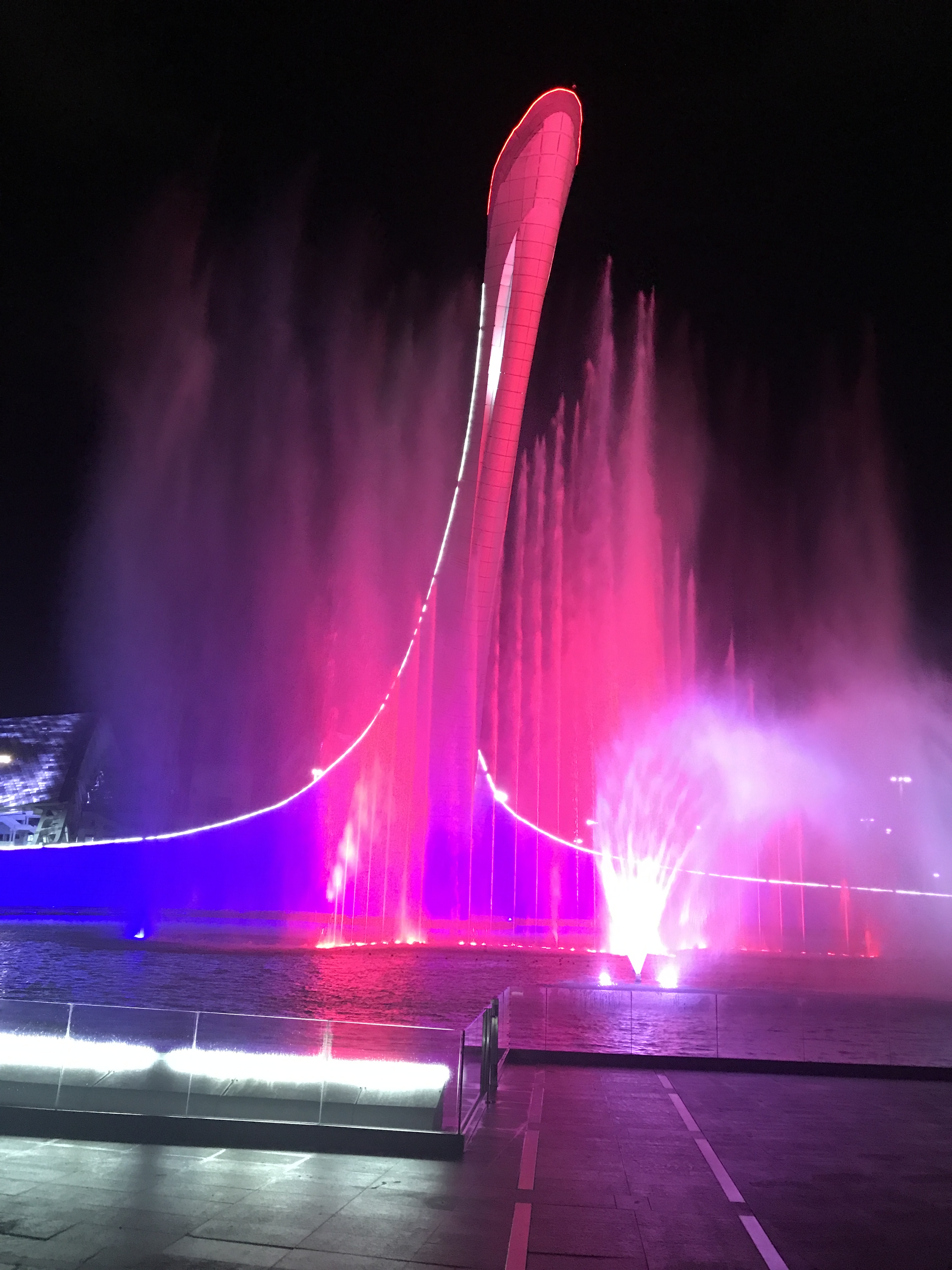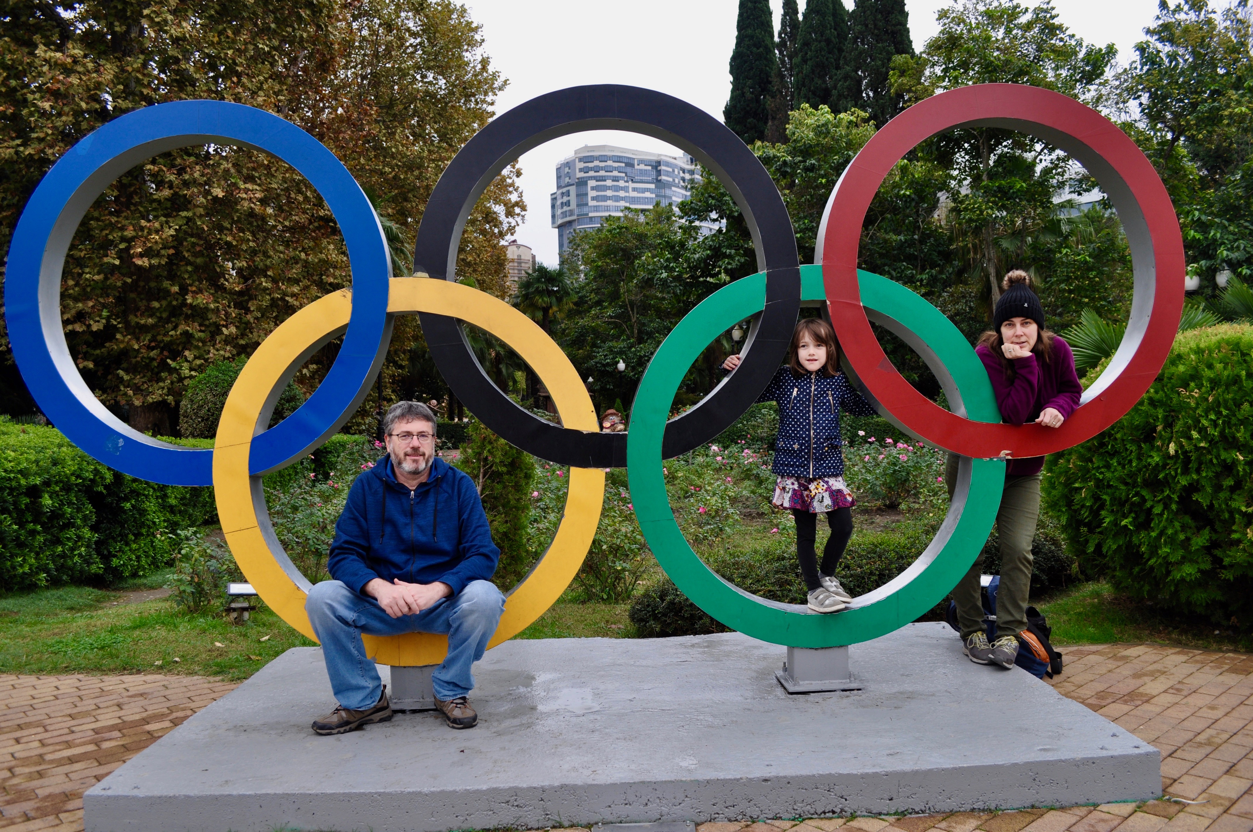 Our trip concluded with a night in Adler, the part of Sochi that hosted the lowland Winter Olympic events. We spent the afternoon strolling about the town as Mila scooted and Alden tested out a skateboard for the first time. We checked out Sochi Park- an amusement park that proclaims to be “Russian Disneyland.” Alden thought it ranked somewhere between Universal Studios and Canobie Lake Park (in New Hampshire). Another highlight in Adler was checking out the Olympic Village, particularly the singing fountains which claim to have the tallest jets of water in the world with maximum heights of nearly 200 feet. We watched two sets at the fountains- the first with Russian and American pop music and the second set to classical music. During the “set break,” we made friends with an almost-retired army communications specialist and her daughter from Yekaterinberg, who invited us to come stay with her. She showed us pictures of her car and told us she’d give us a tour.