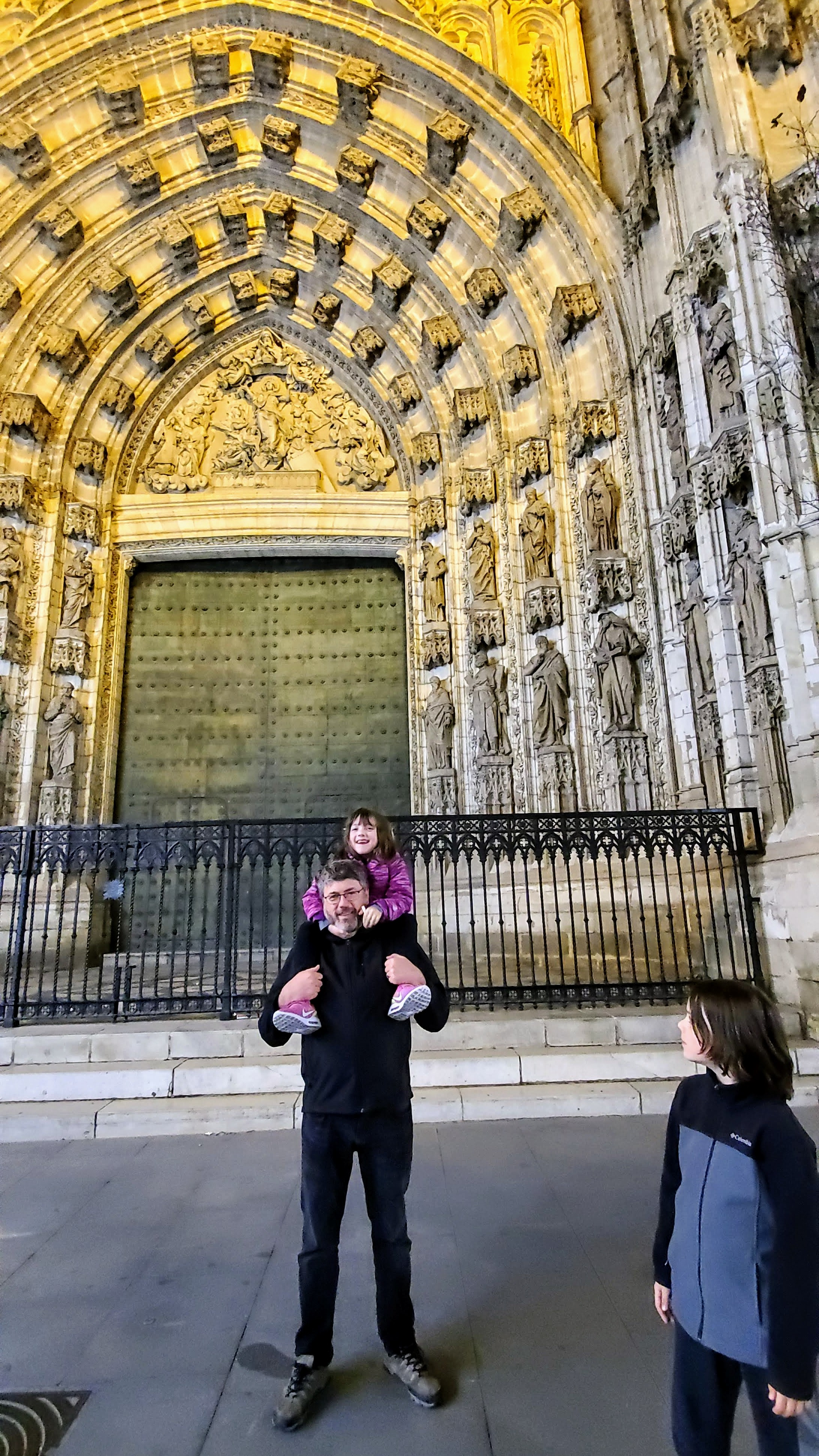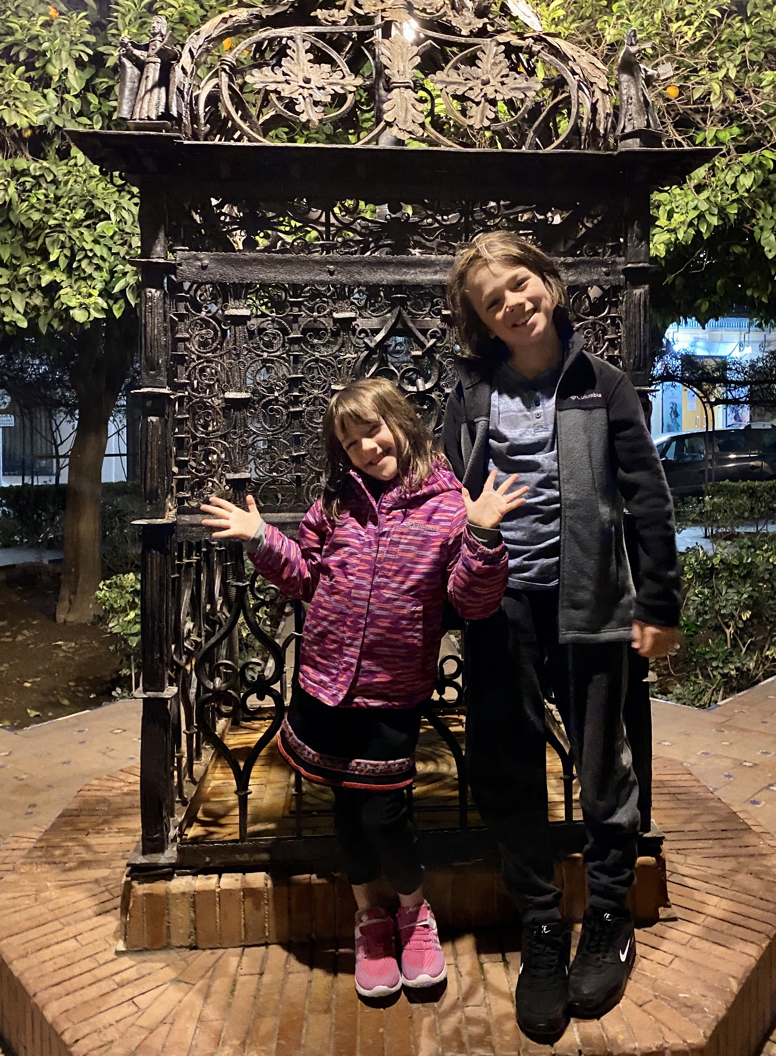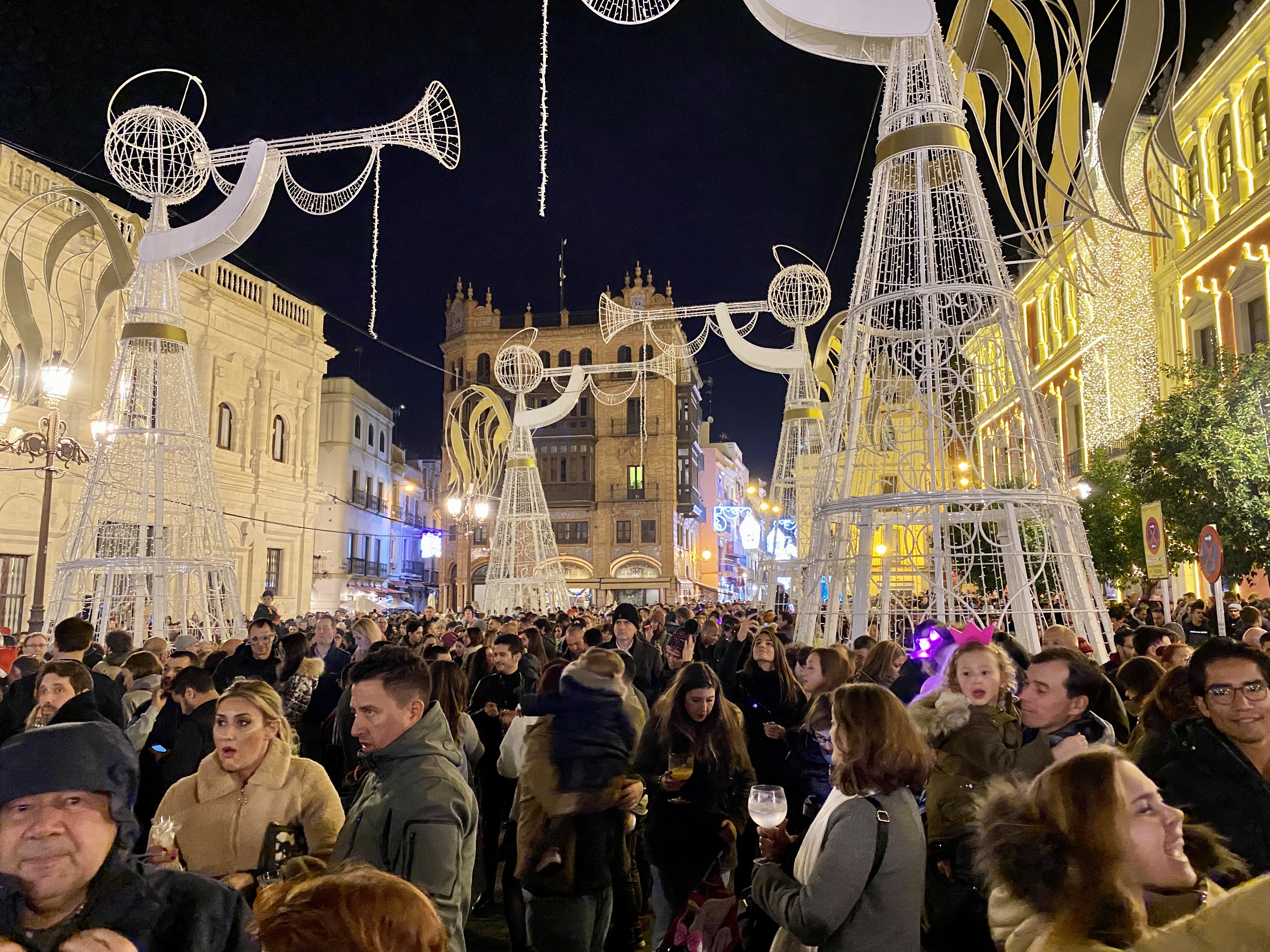 After Salobrena, my parents and sister and Michael headed back to Malaga to catch their flights home, and we continued on to Seville to ring in the New Year. We had heard that the place to be in Seville at midnight was Plaza Nueva, which was a short walk from our rental. So after dinner and a long stroll, we headed into the square and bought two overpriced bags of 12 slightly mushy grapes so the kids could participate in the Spanish NY tradition of eating one grape per chime of midnight. The Plaza was packed and had a festive feel, however the midnight ritual seemed a little anti-climactic. I think we were expecting at least some church bells and a semi-coordinated countdown and hoping for maybe a light/music show (we had heard what we thought was a soundcheck earlier) or some fireworks. But it turns out that the celebration is more about people coming together to hang out, drink, throw confetti, and be merry. We enjoyed ourselves, despite it not being exactly what we thought we would experience.