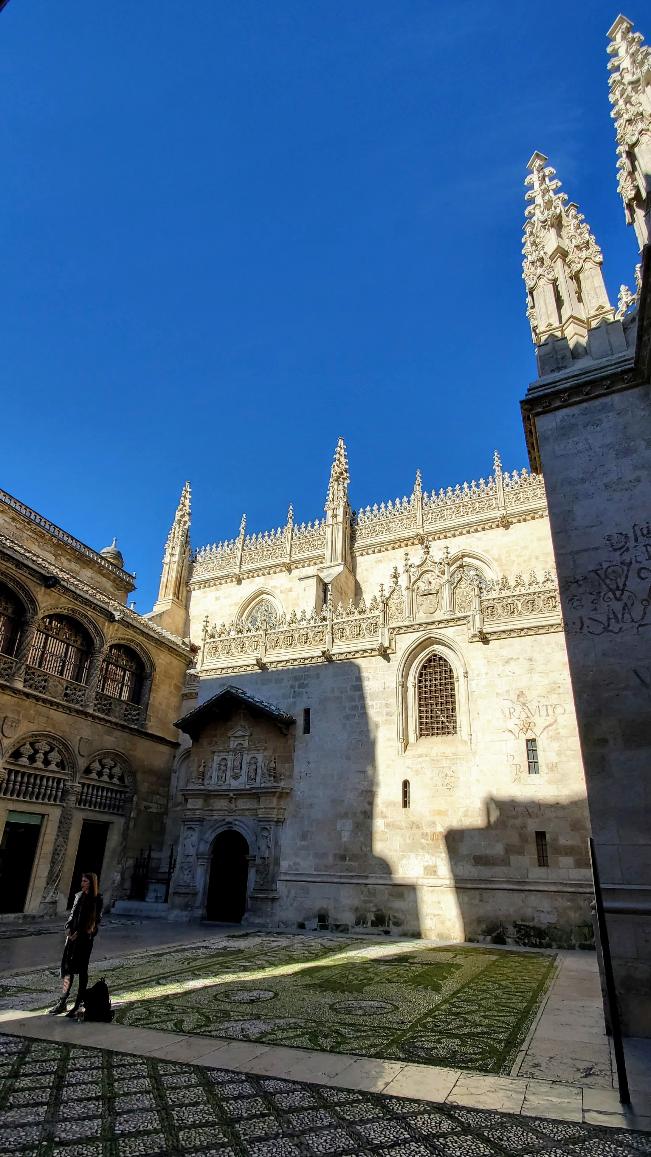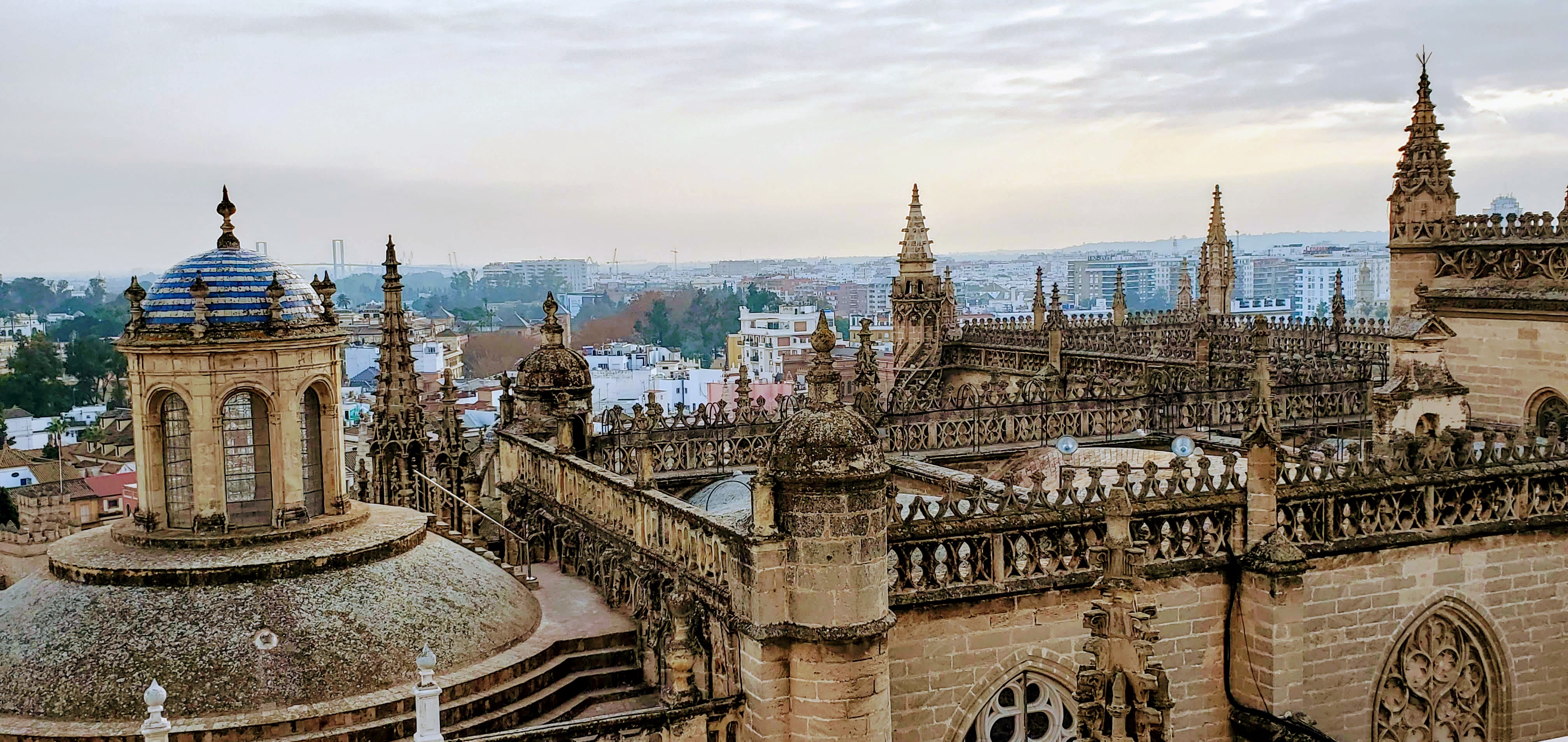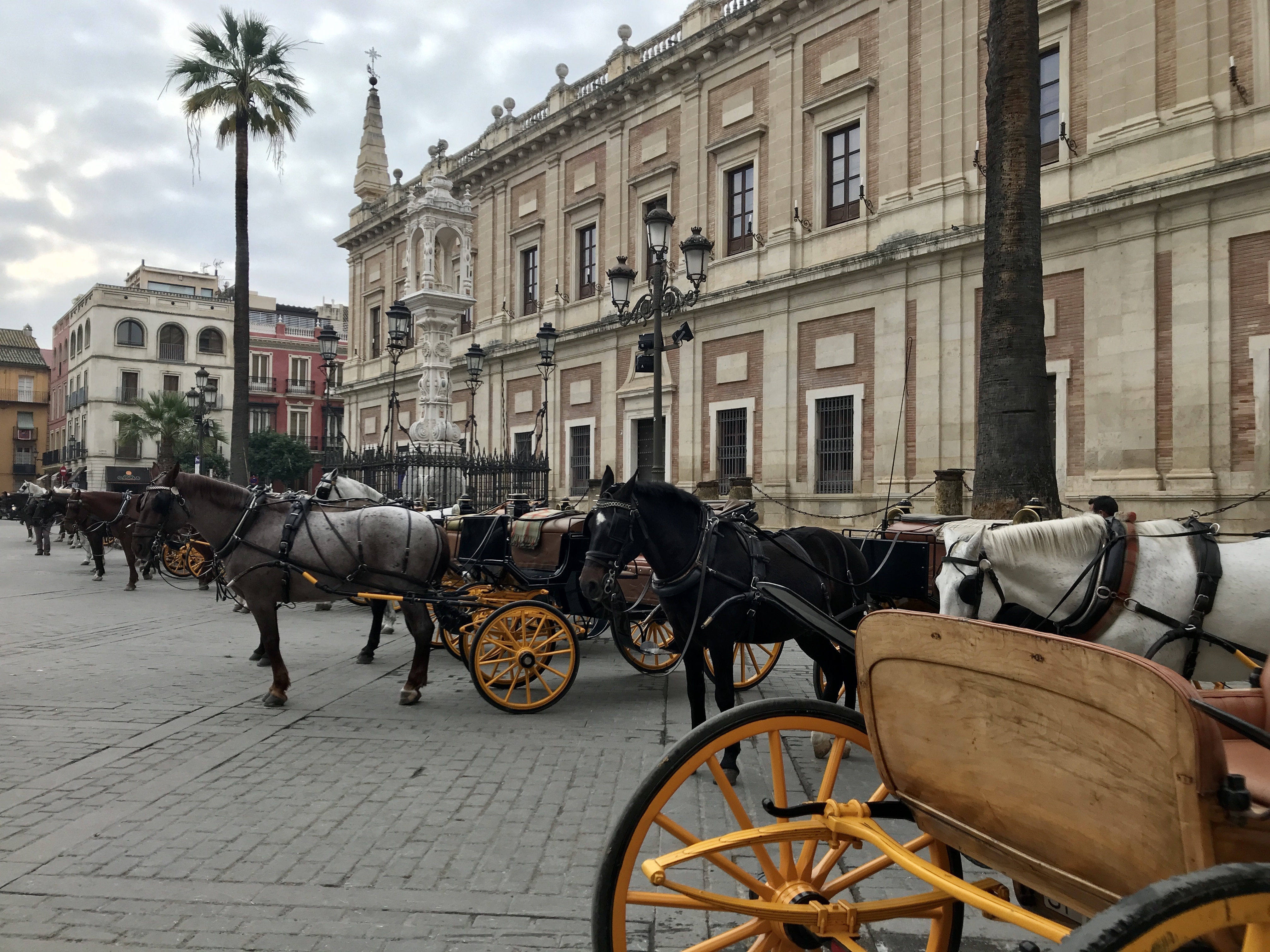 After Salobrena, my parents and sister and Michael headed back to Malaga to catch their flights home, and we continued on to Seville to ring in the New Year. We had heard that the place to be in Seville at midnight was Plaza Nueva, which was a short walk from our rental. So after dinner and a long stroll, we headed into the square and bought two overpriced bags of 12 slightly mushy grapes so the kids could participate in the Spanish NY tradition of eating one grape per chime of midnight. The Plaza was packed and had a festive feel, however the midnight ritual seemed a little anti-climactic. I think we were expecting at least some church bells and a semi-coordinated countdown and hoping for maybe a light/music show (we had heard what we thought was a soundcheck earlier) or some fireworks. But it turns out that the celebration is more about people coming together to hang out, drink, throw confetti, and be merry. We enjoyed ourselves, despite it not being exactly what we thought we would experience.