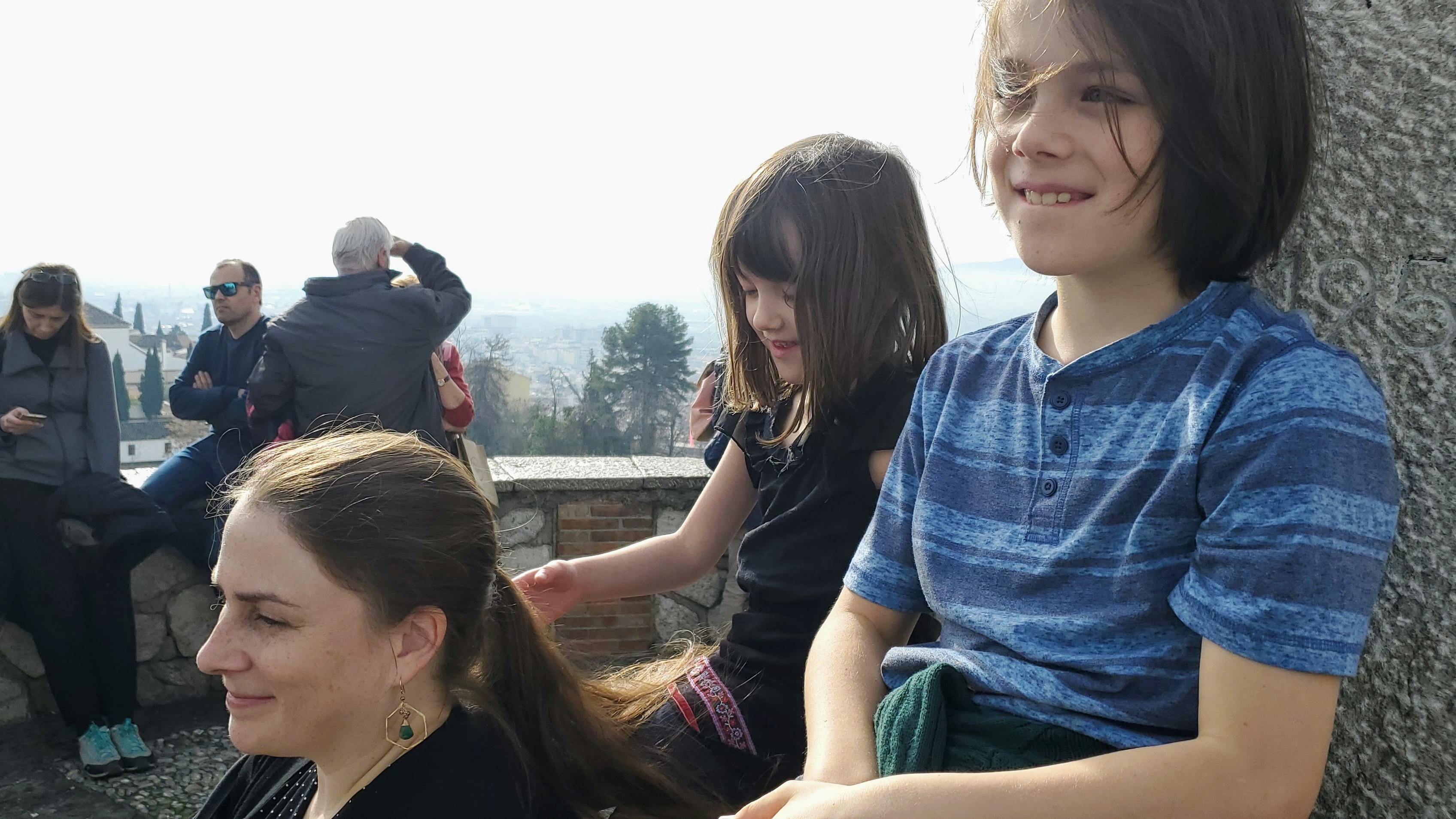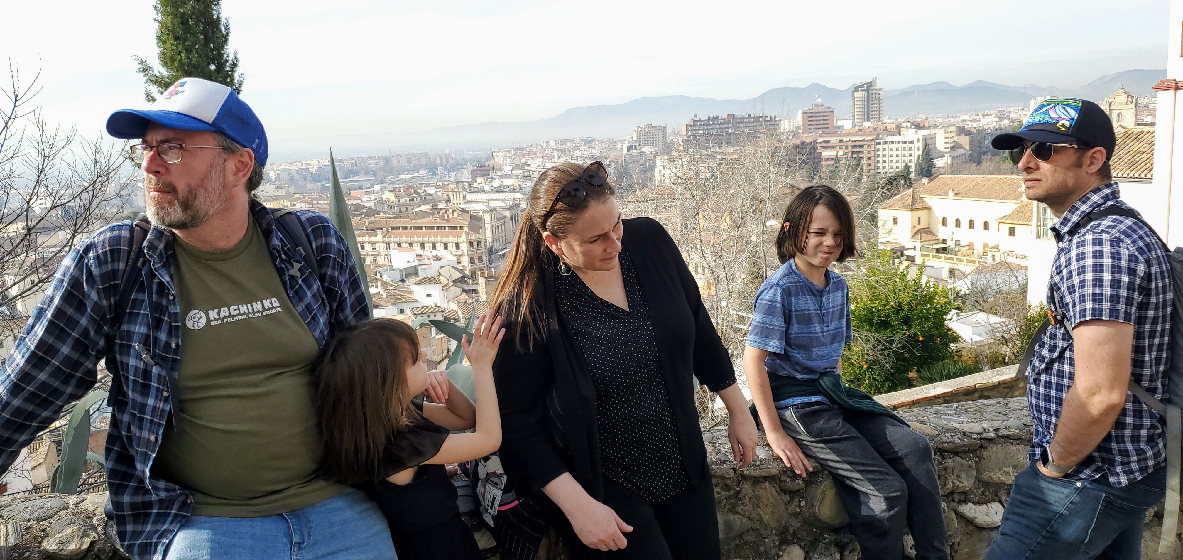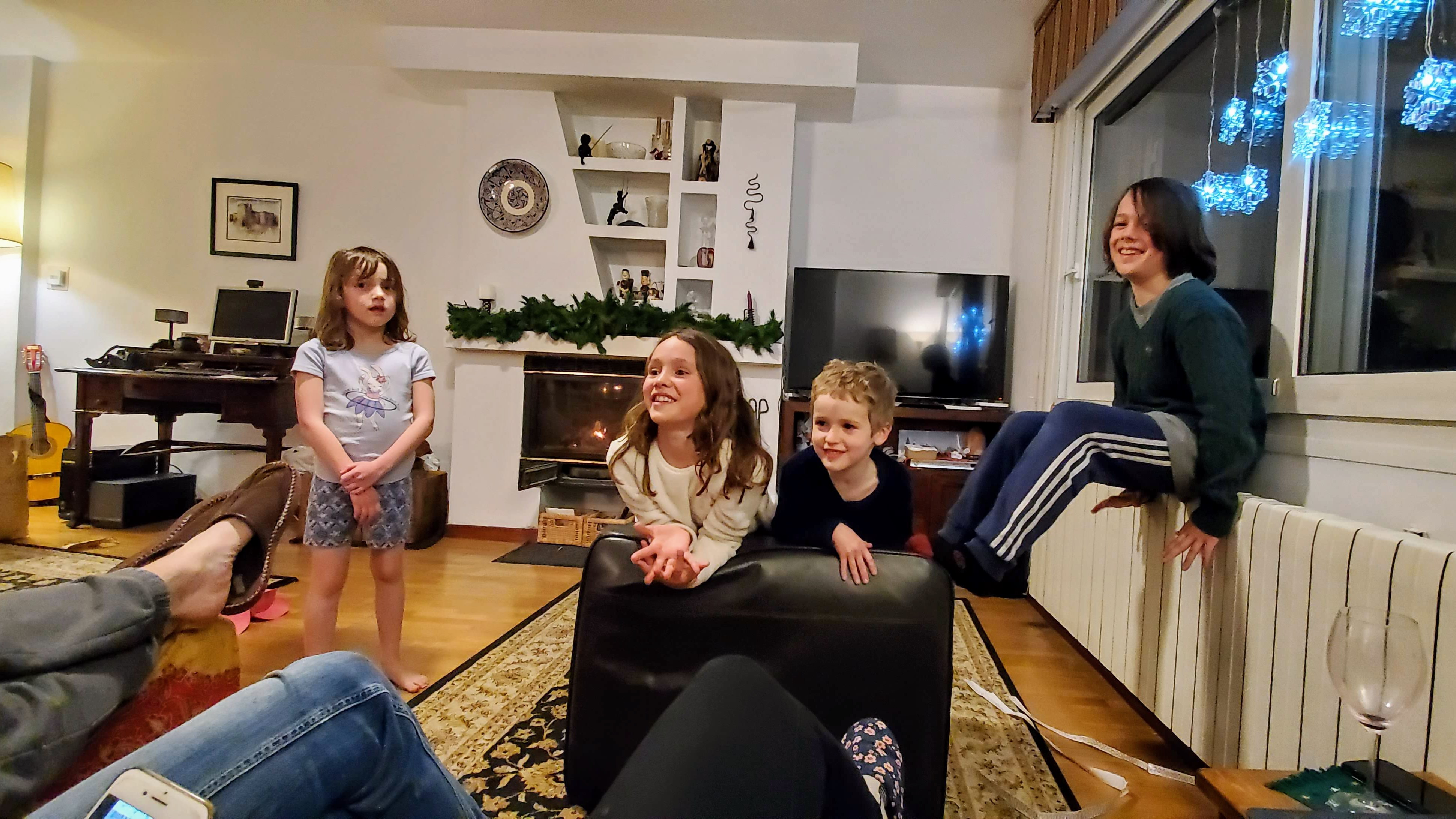 This winter the kids were a bit disappointed at the lack of holiday decor in our apartment. Nana came to the rescue, with a suitcase full of dreidels, gelt, a menorah, the kids’ hand-embroidered personalized stockings, gingerbread house and train kits, a tin of Christmas cookies, and a bag of tiny Christmas ornaments, not to mention all the presents. While we were searching for Senora Sesos, Nana was on a mission to find a tiny tree. In one of the plazas near our rental we both succeeded, us finding S.S. and Nana finding a tree at a stand selling trees and other miniatures for nativity scenes. Christmas was saved! On Christmas Eve, Alden, Mila and Nana entertained us with a Christmas play and dance. We had a fun morning relaxing in our PJs and then Poppy, Michael, Emily, Simon and I joined the locals for a late morning/early afternoon stroll through the streets. Later, Alden, Emily and Mila tested us on our Christmas knowledge with a fun game of Kahoot.