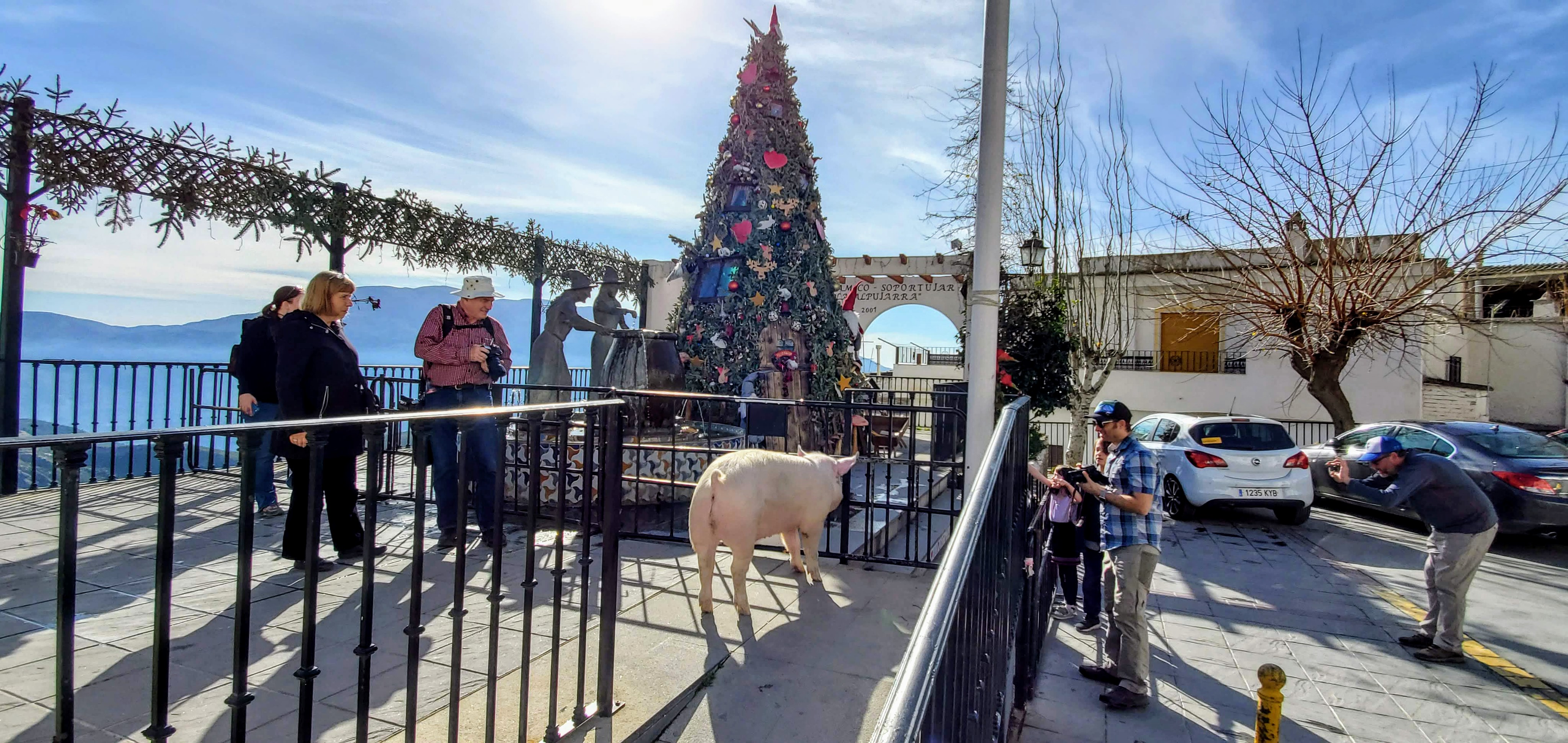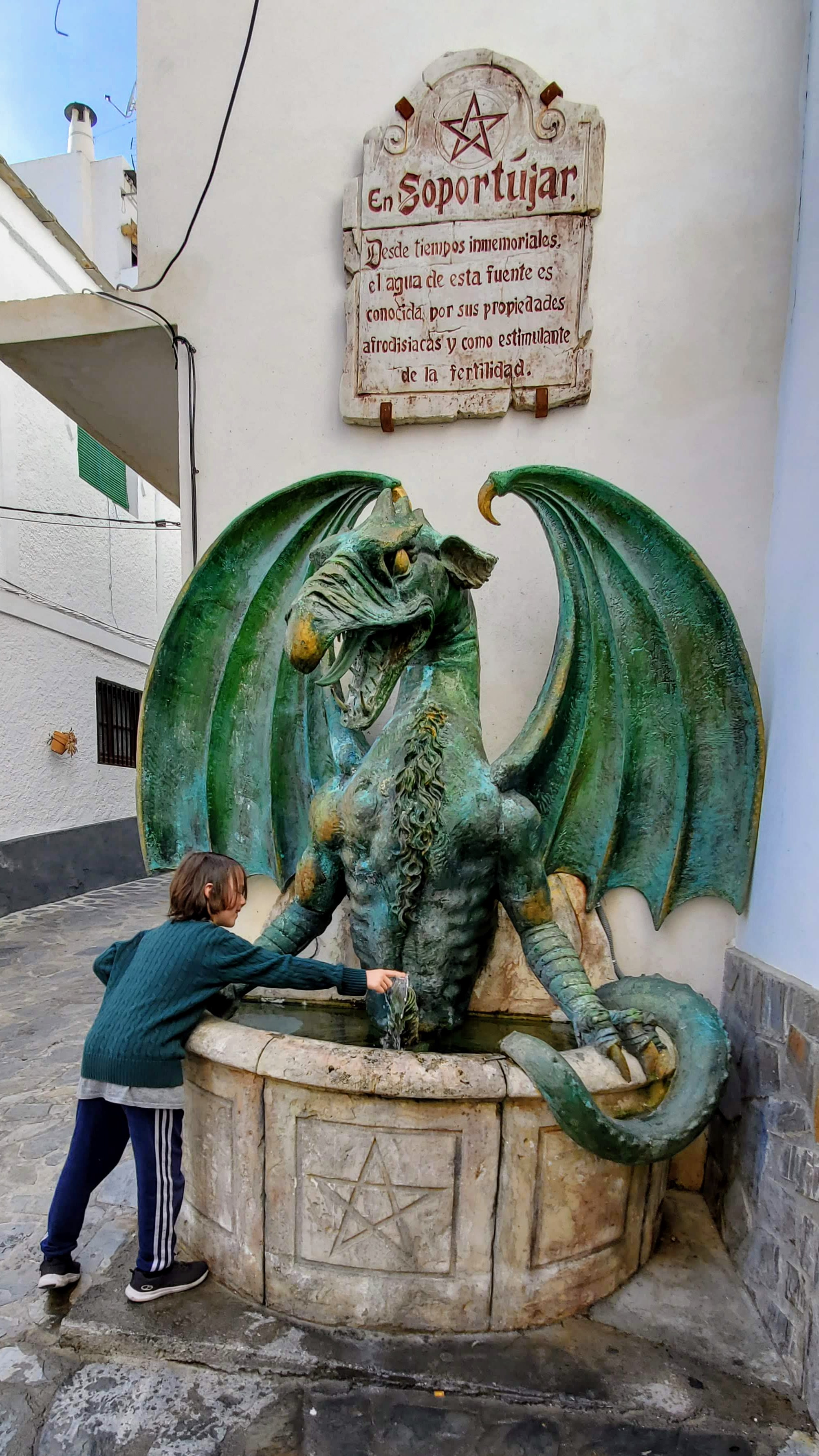 The next stop on our journey was a very unique mountain town with a witch theme, Soportujar. When asking the kids about the top 10 highlights of this trip, this town made the cut. The roadside into the town had interesting sculptures and in the center was a big tree with a witch cauldron statue. While there we met the town pig and after a brief jaunt down a side street came to the dragon penis fountain (as we named it) that apparently had some fertility-inducing powers.