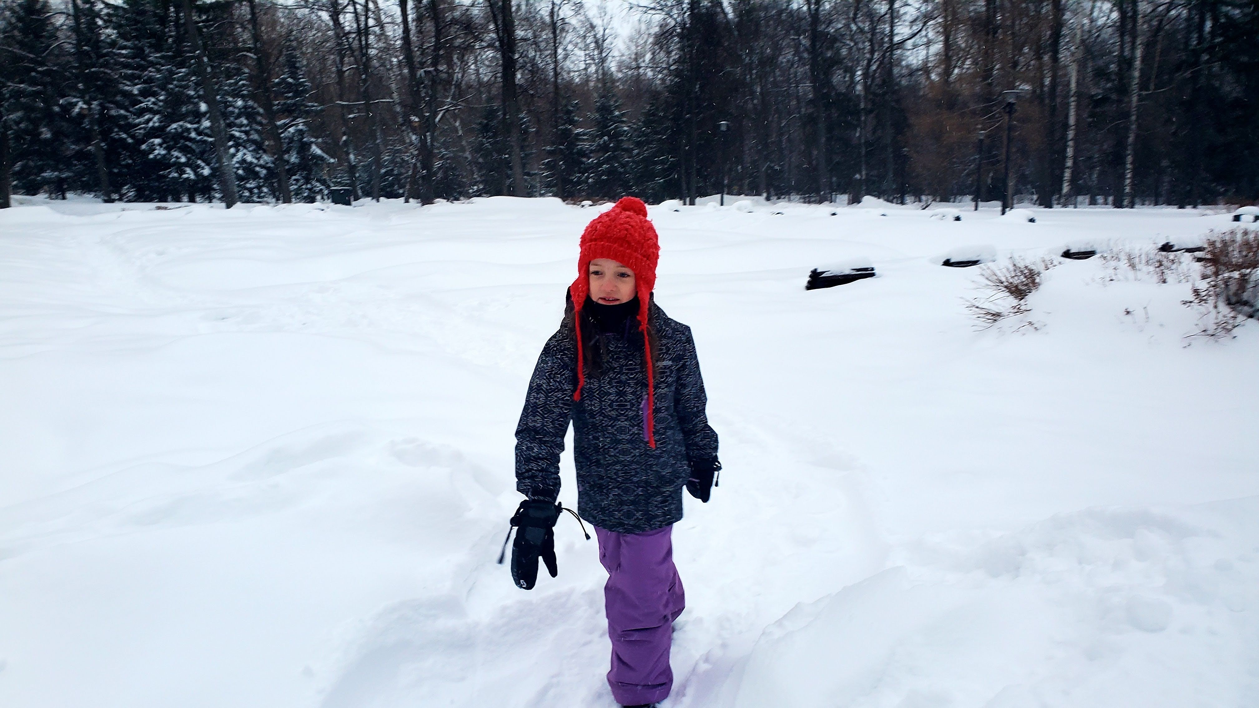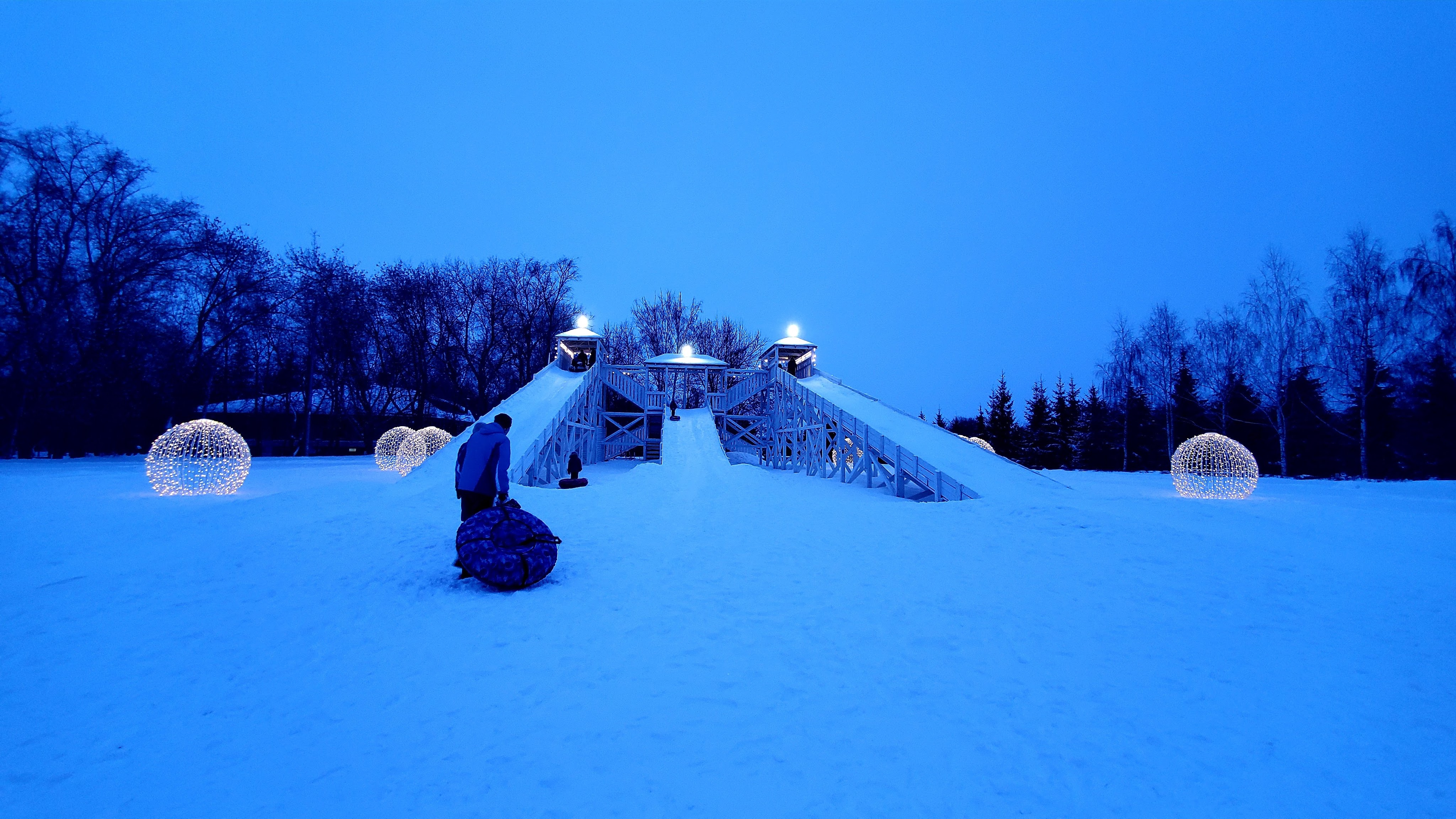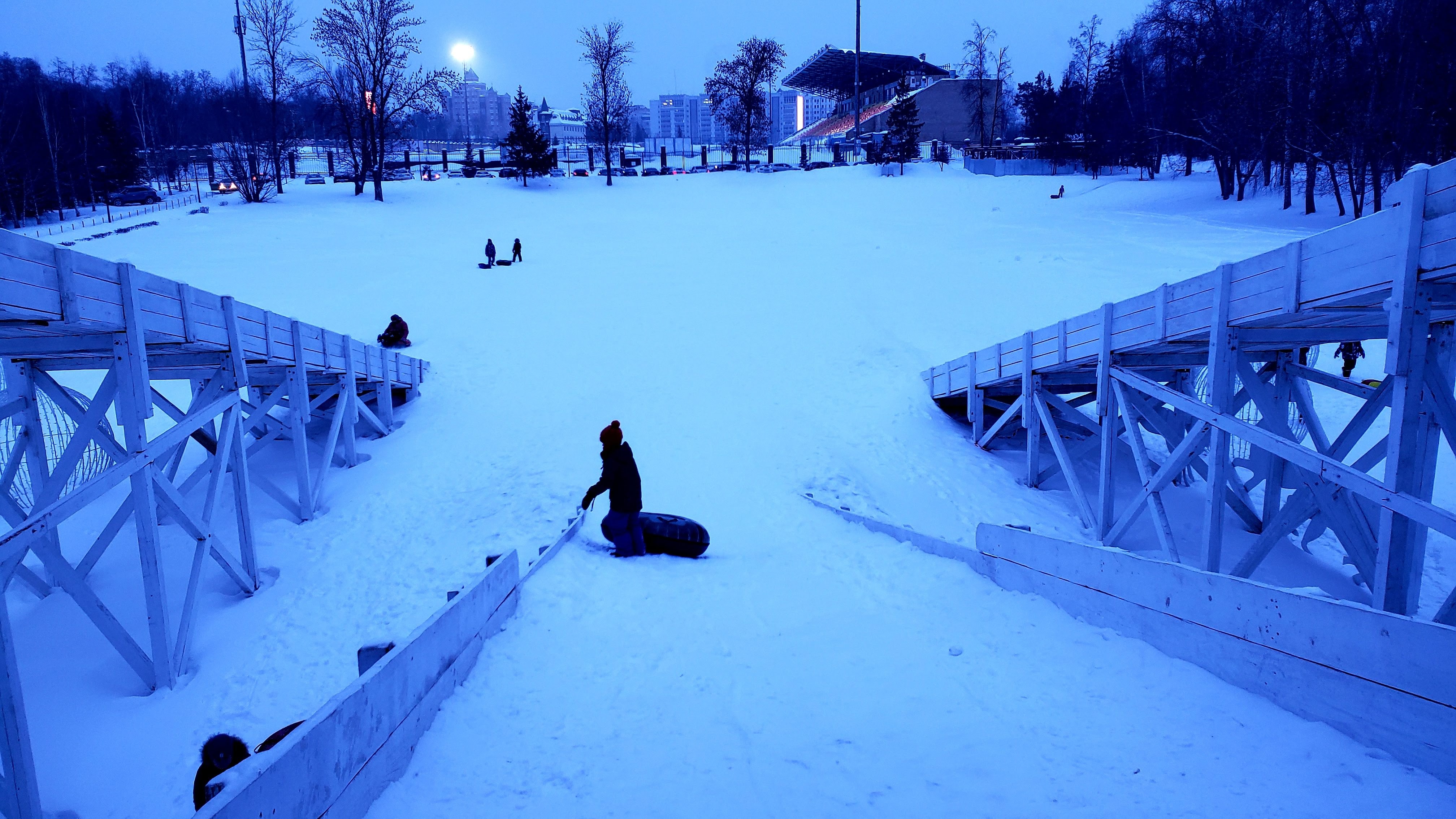 Alden’s friend from school invited him to spend the weekend at his family’s Dacha. While he was gone, we took Mila to another city park to see if we could find any ice sculptures. Our search for ice sculptures was not successful, but we did manage to find a fun sledding site. We rented an inner tube for 30 minutes (that was about as long as it was comfortable to stay outside) and Mila built up her courage to go down the middle ramp.
