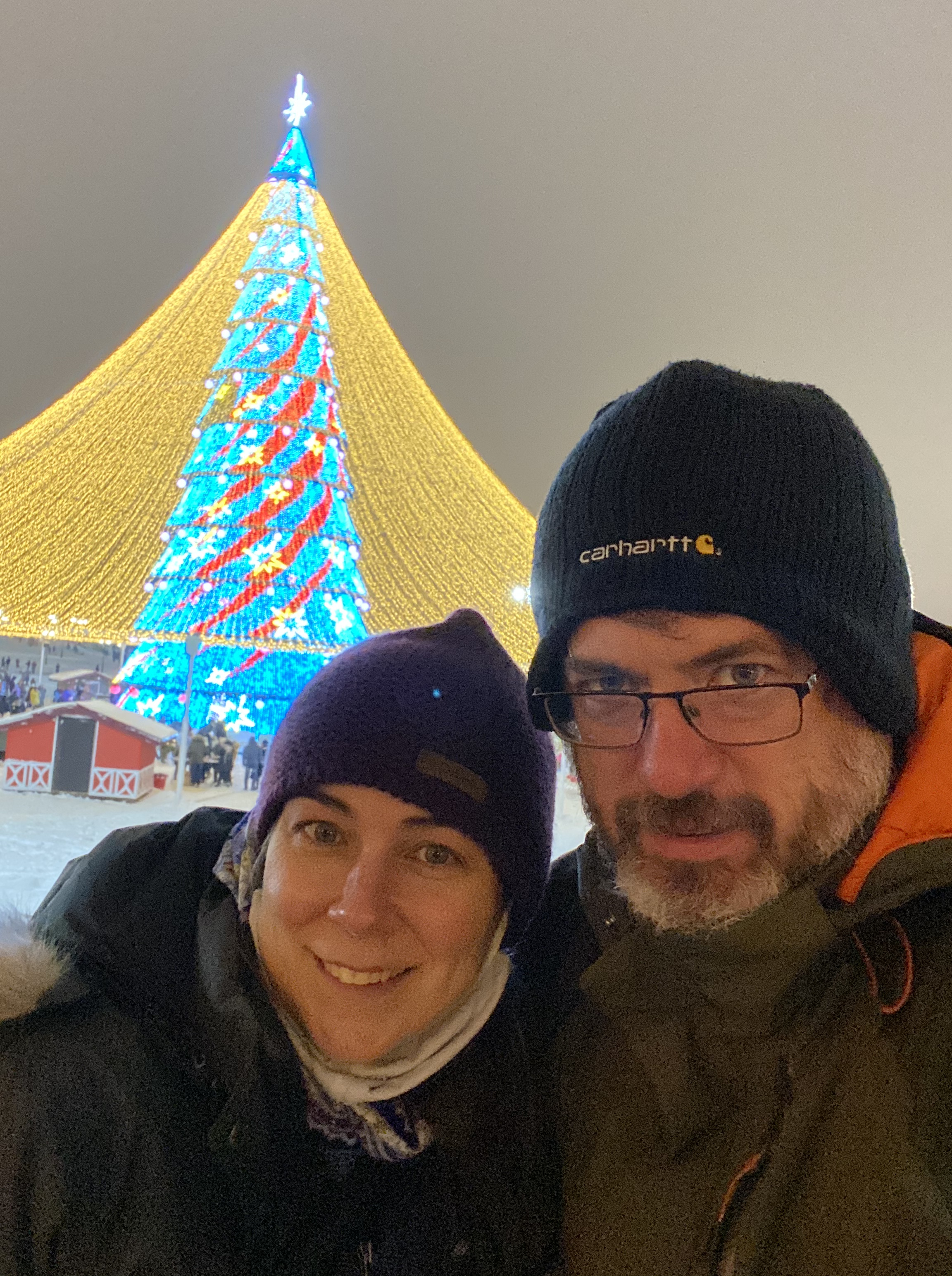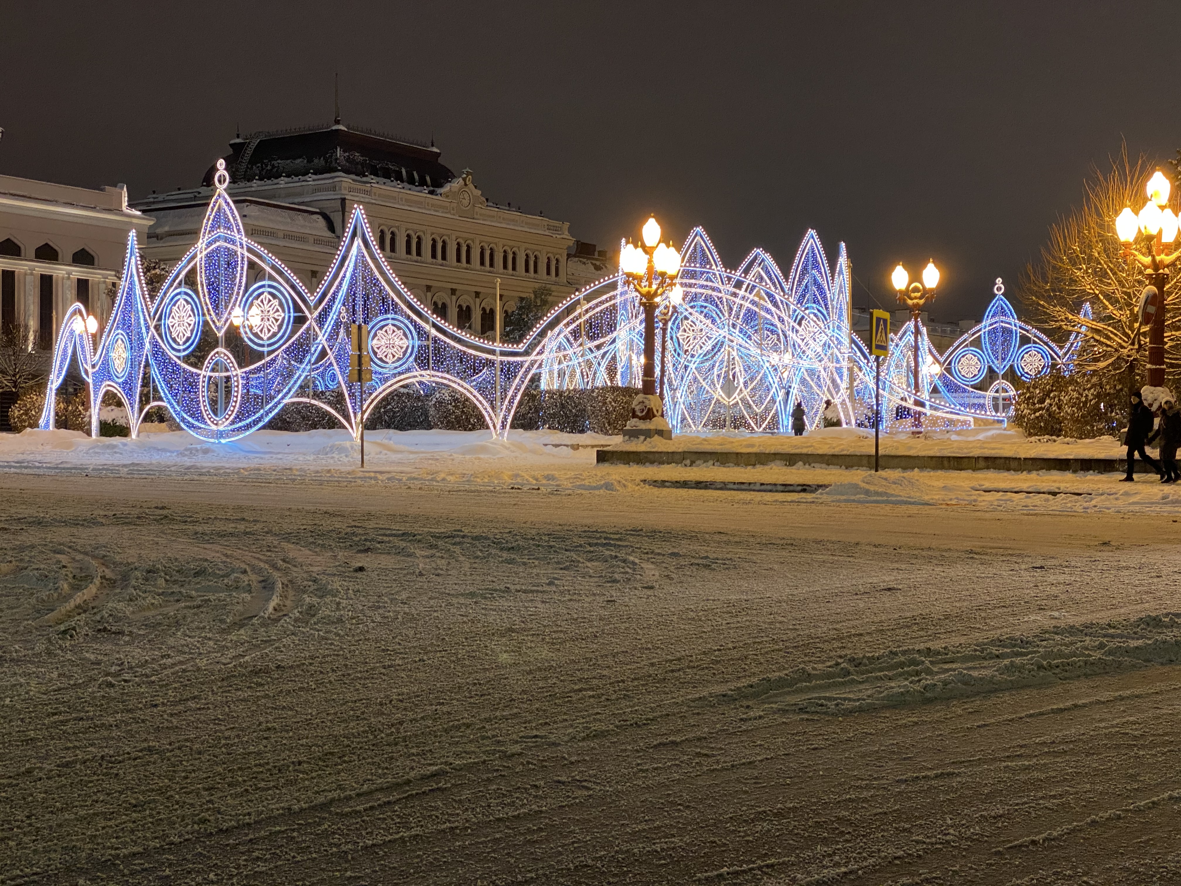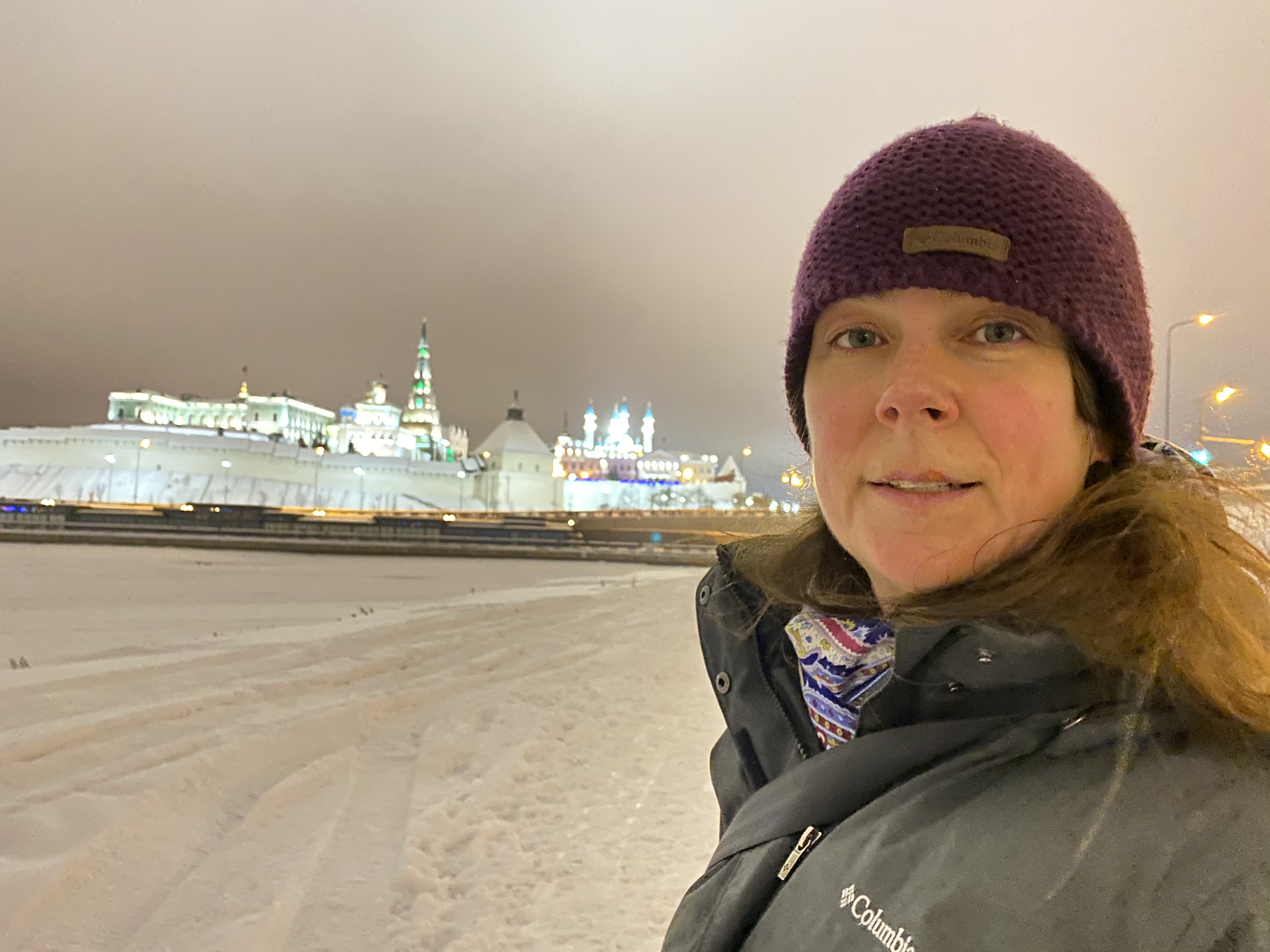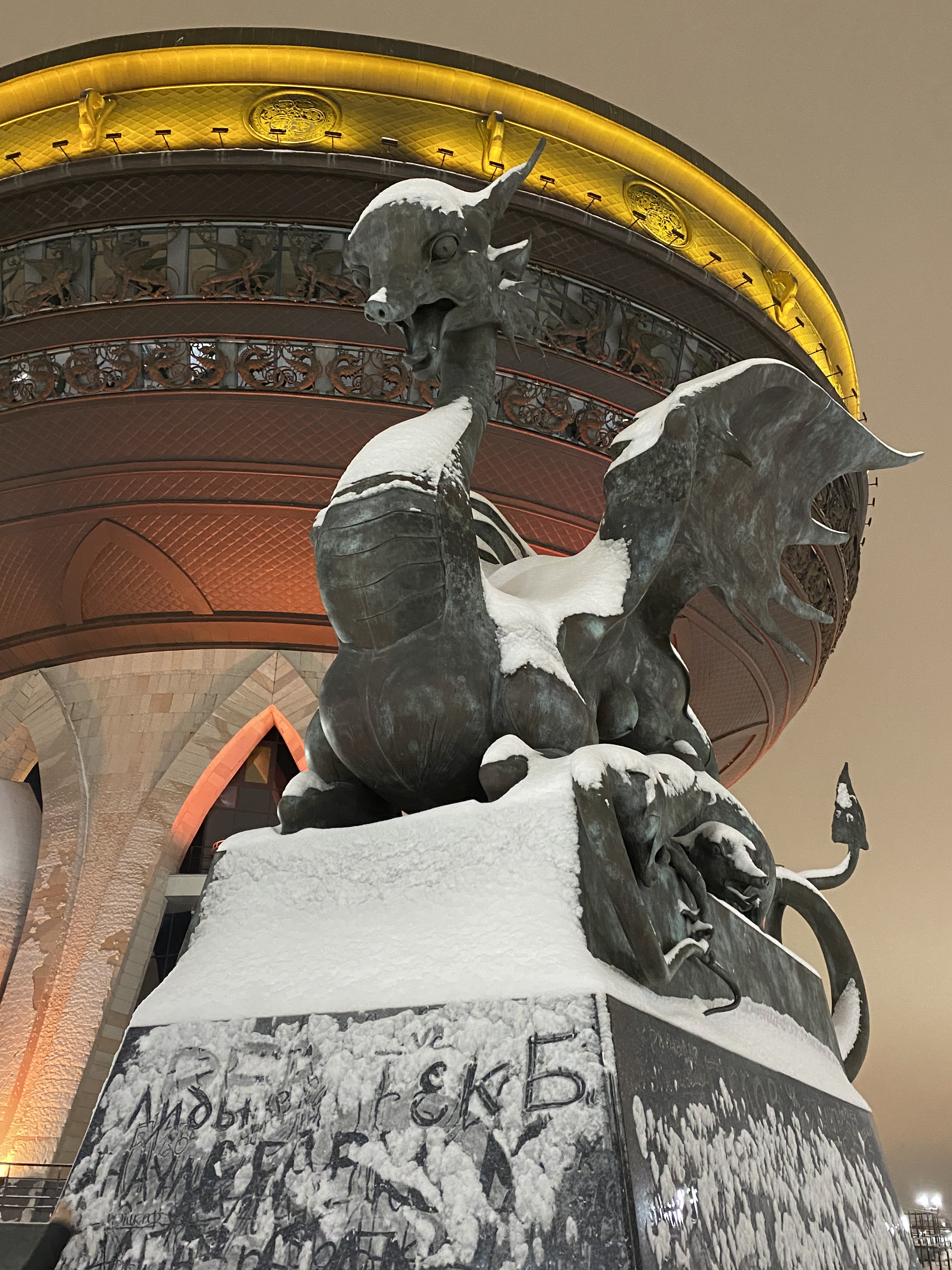 After our return from Baikal, we were excited to have a week left of our vacation to explore Kazan. In Russia, the main winter festivities happen in the first week of January so our timing was perfect to enjoy the decorations including luminous trees and other light displays. Unfortunately, the kids were ready to just chill and resisted our attempts to lure them outside. “Come on! It’s warm! It’s only 11° F (-12° C)!” They weren’t convinced. Fortunately, our trusty babysitter Maeve was happy to come over, so Simon and I went out on a date night to explore the city in all it’s lit-up winter glory. We headed across the Kazanka River to the Kazan Palace of Marriage- known locally as “the Cup” to check out the main New Year tree, a 34-meter tall tree with over 1,280 lights that are synchronized with music and is supposedly visible from space. For us though, the highlight was seeing the zilant dragon statues, dusted in snow and covered with snowfiti. After checking out the tree and the cup, we walked back over the river, watching hovercrafts and snowmobiles fly over the ice, and then strolled through the city.