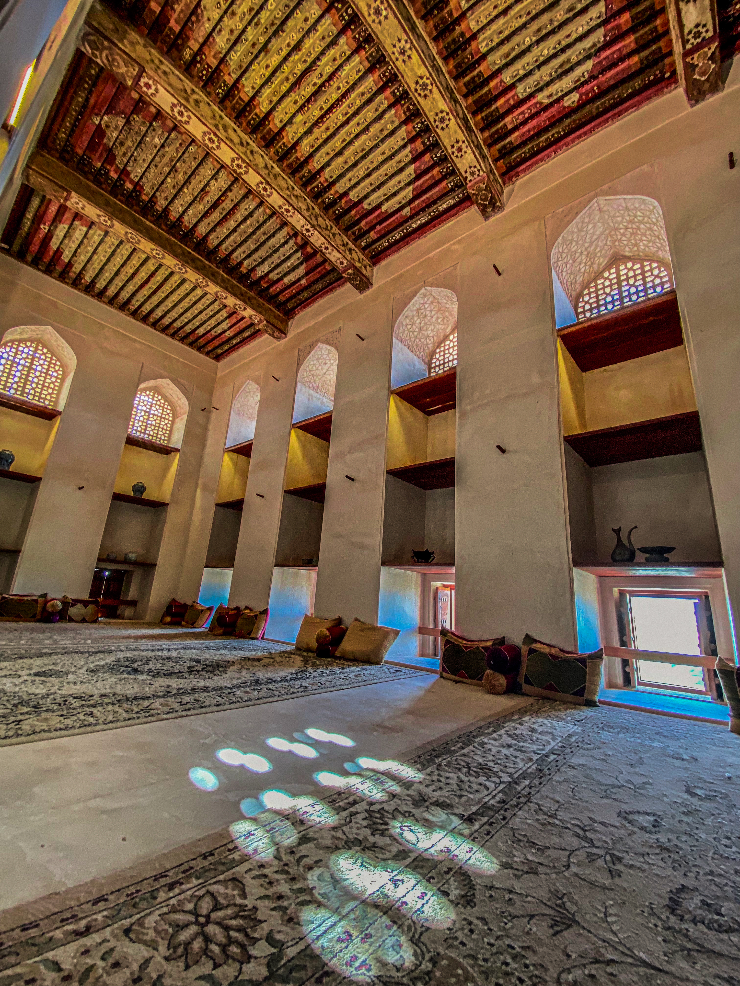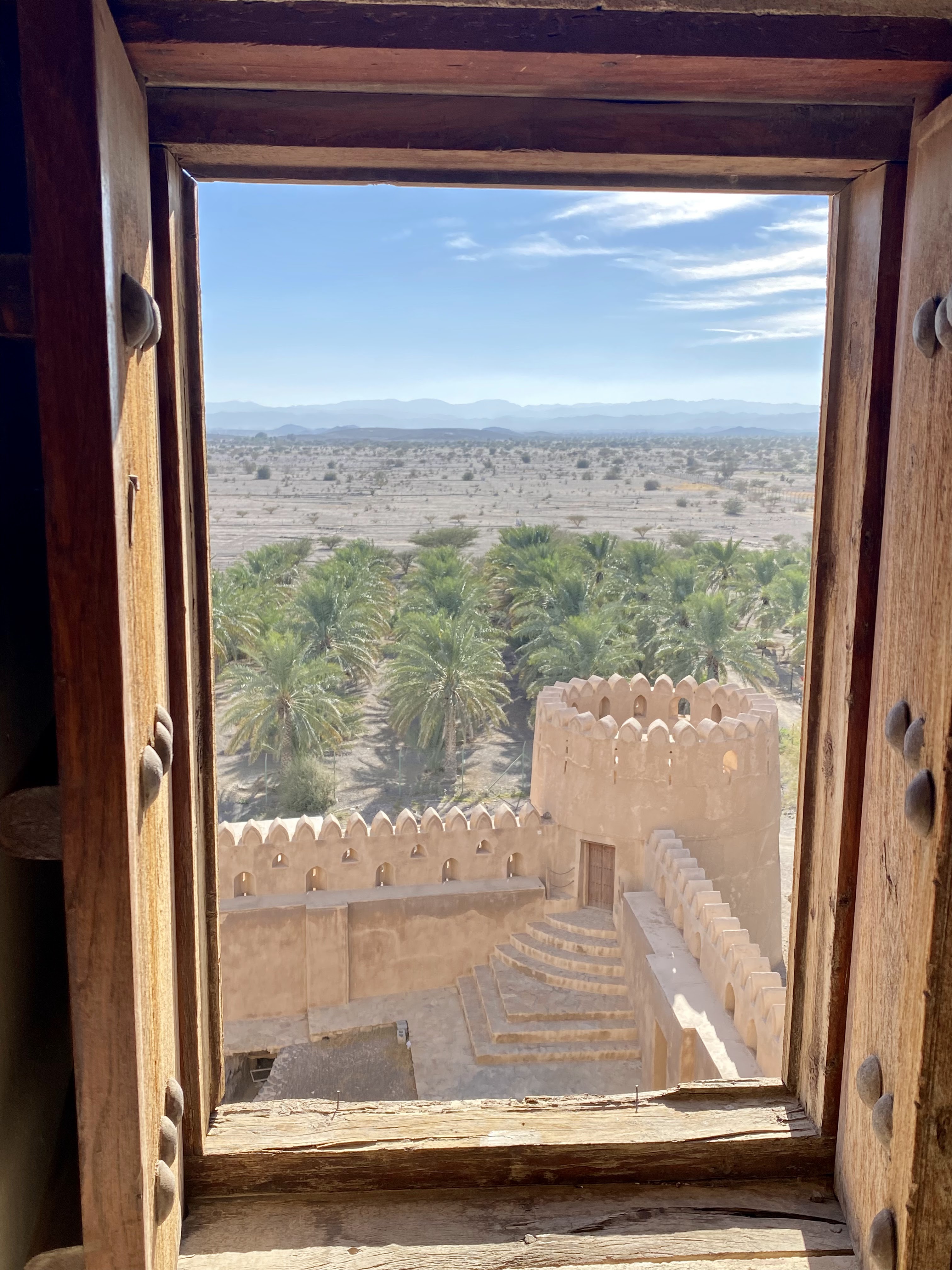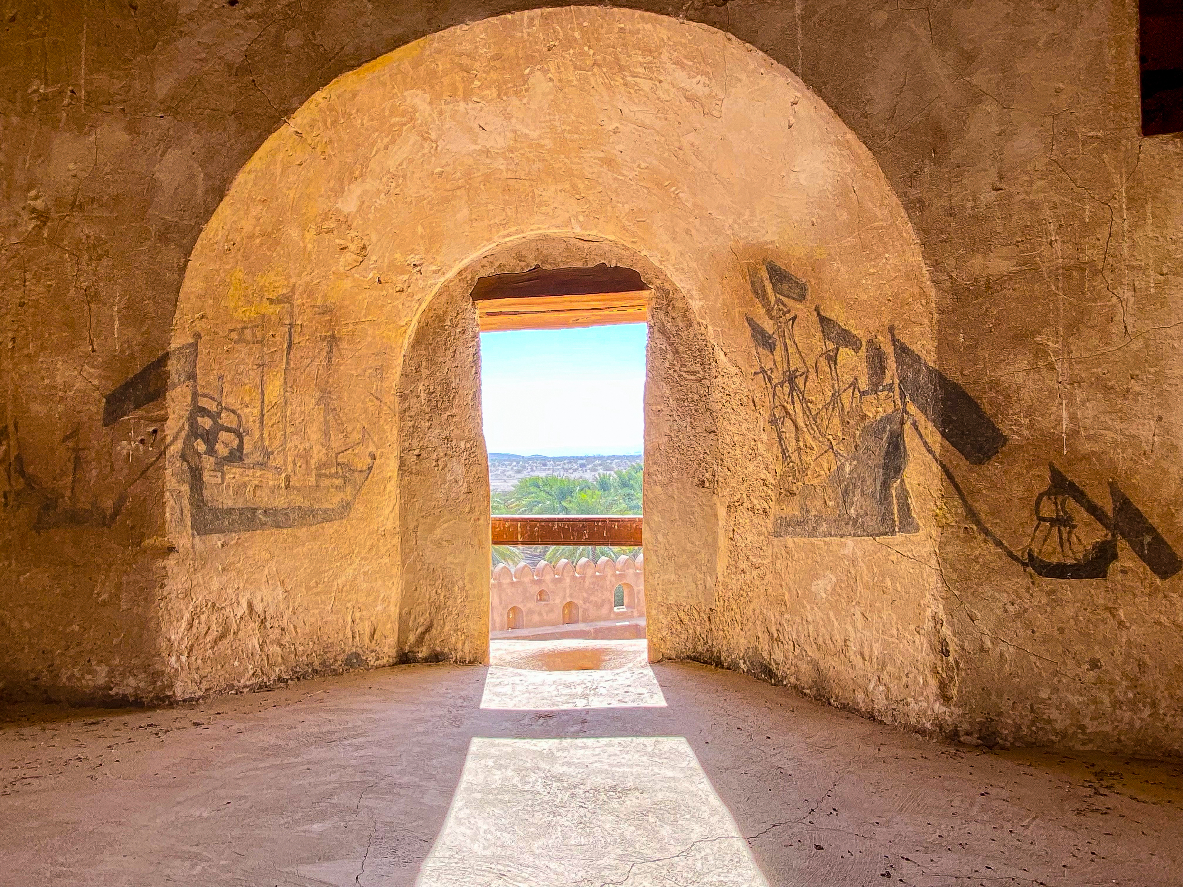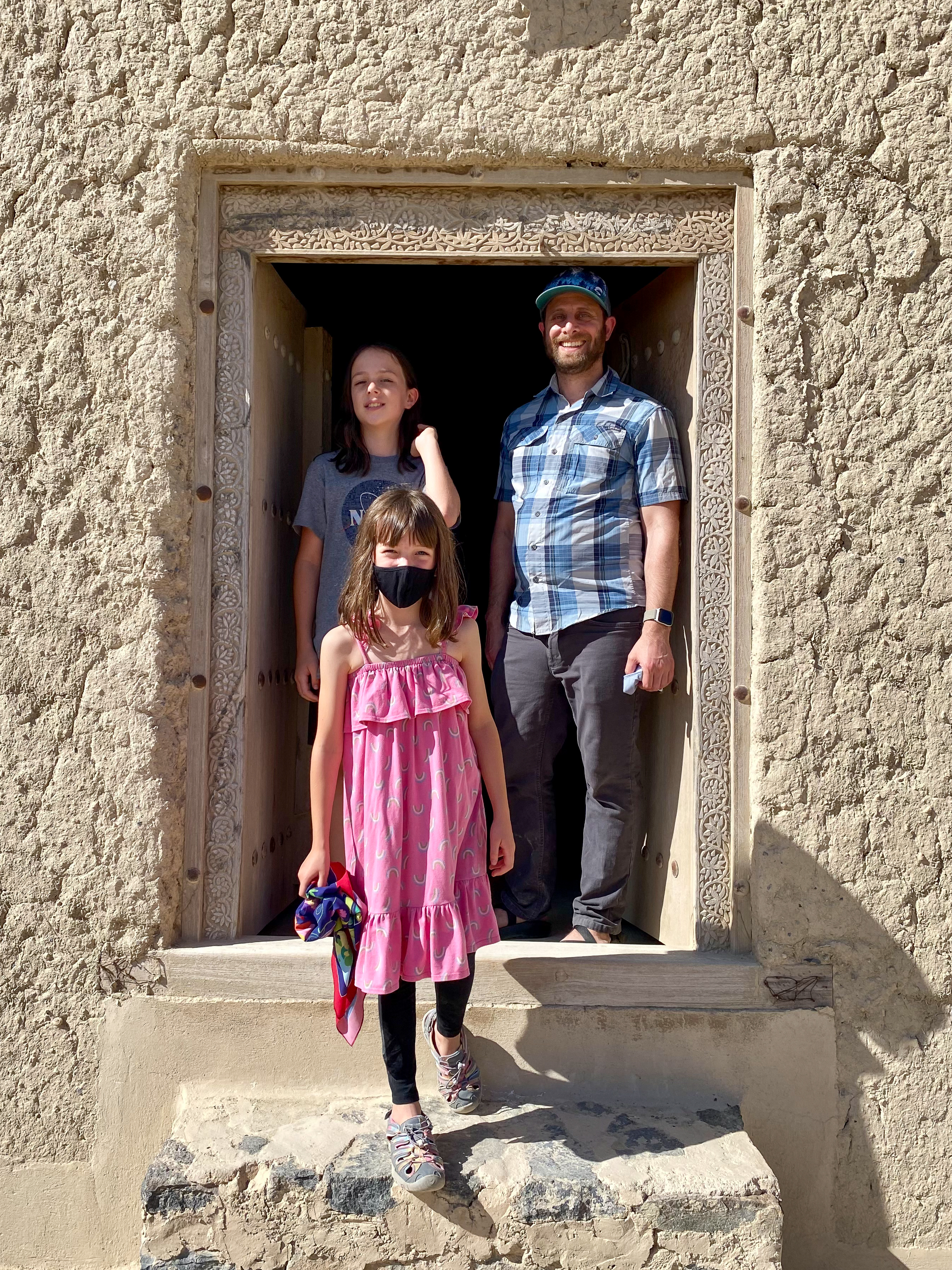 After the fort, we wandered around Jabreen castle, exploring all the nooks and crannies of this impressive structure which was built in 1675 by Imam Bil-Arab Bin Sultan. The castle included towers, a burial chamber, kitchen and dining areas, a court room, a library, classrooms, and reception rooms including the Sun and Moon room where the Imam would entertain his most important guests. There was also a “whispering room” where top-secret information was shared on a need-to-know basis. Mila enjoyed crawling into the women’s prison cells and my mom and Mila enjoyed crawling out the dedicated exit of the courtroom for the guilty, requiring anyone passing that way to stoop in shame.