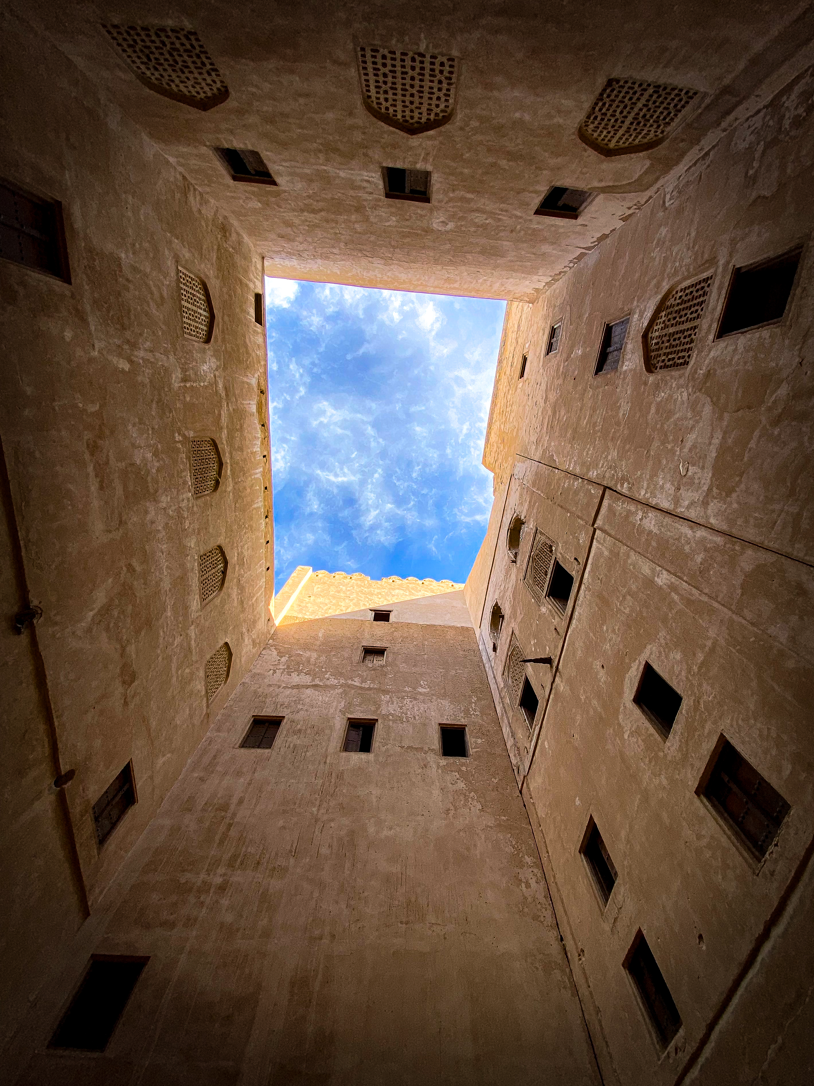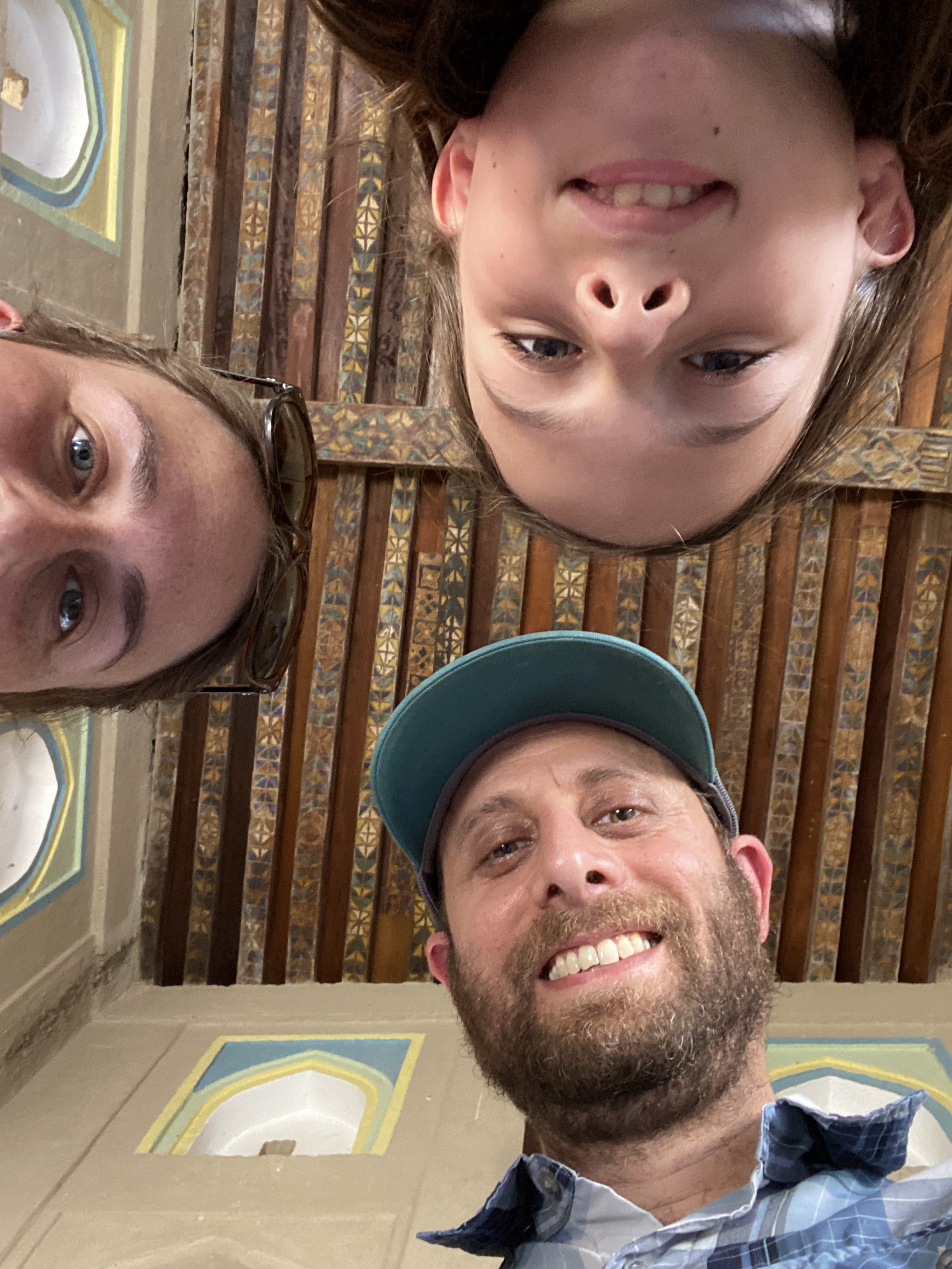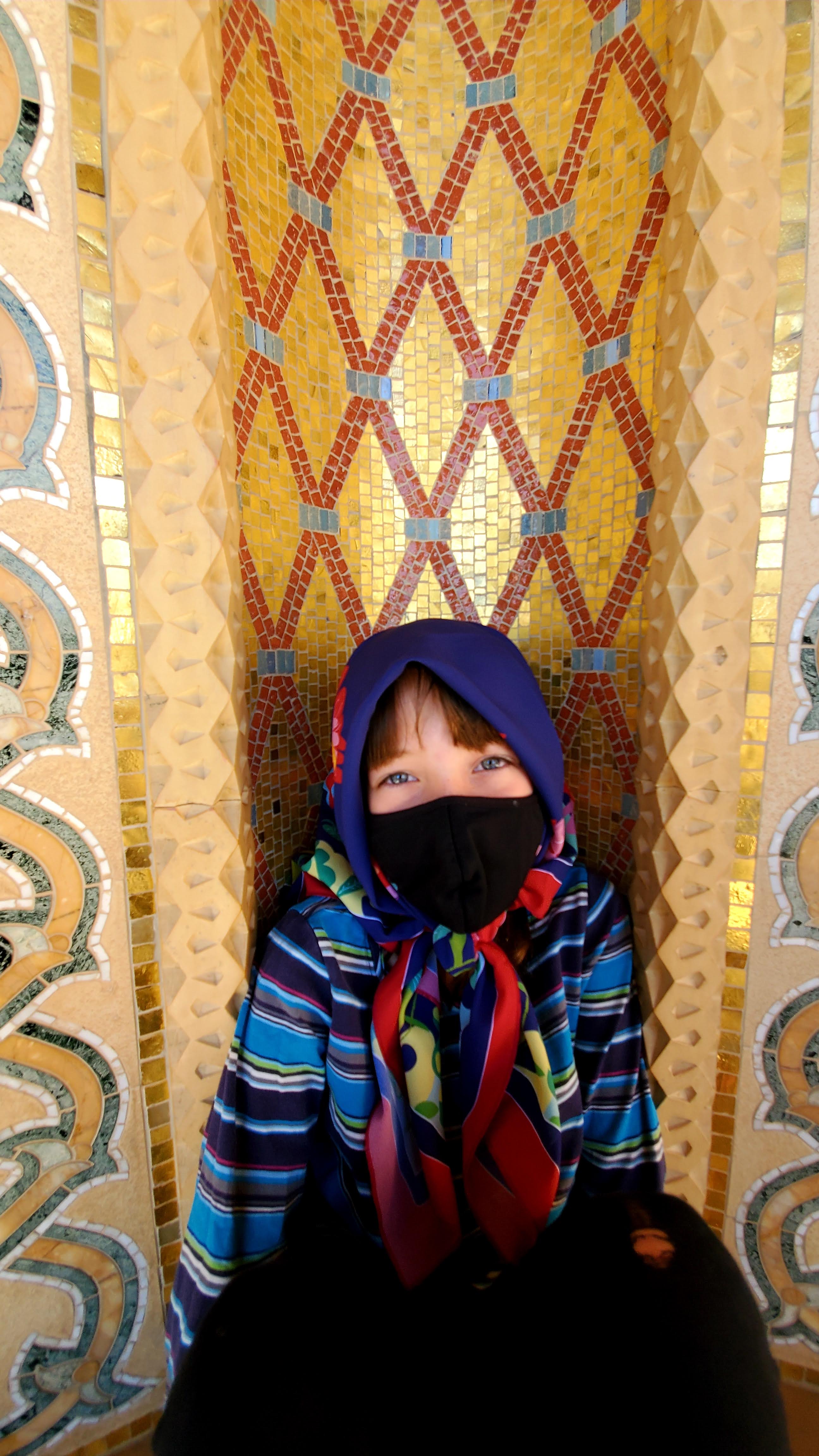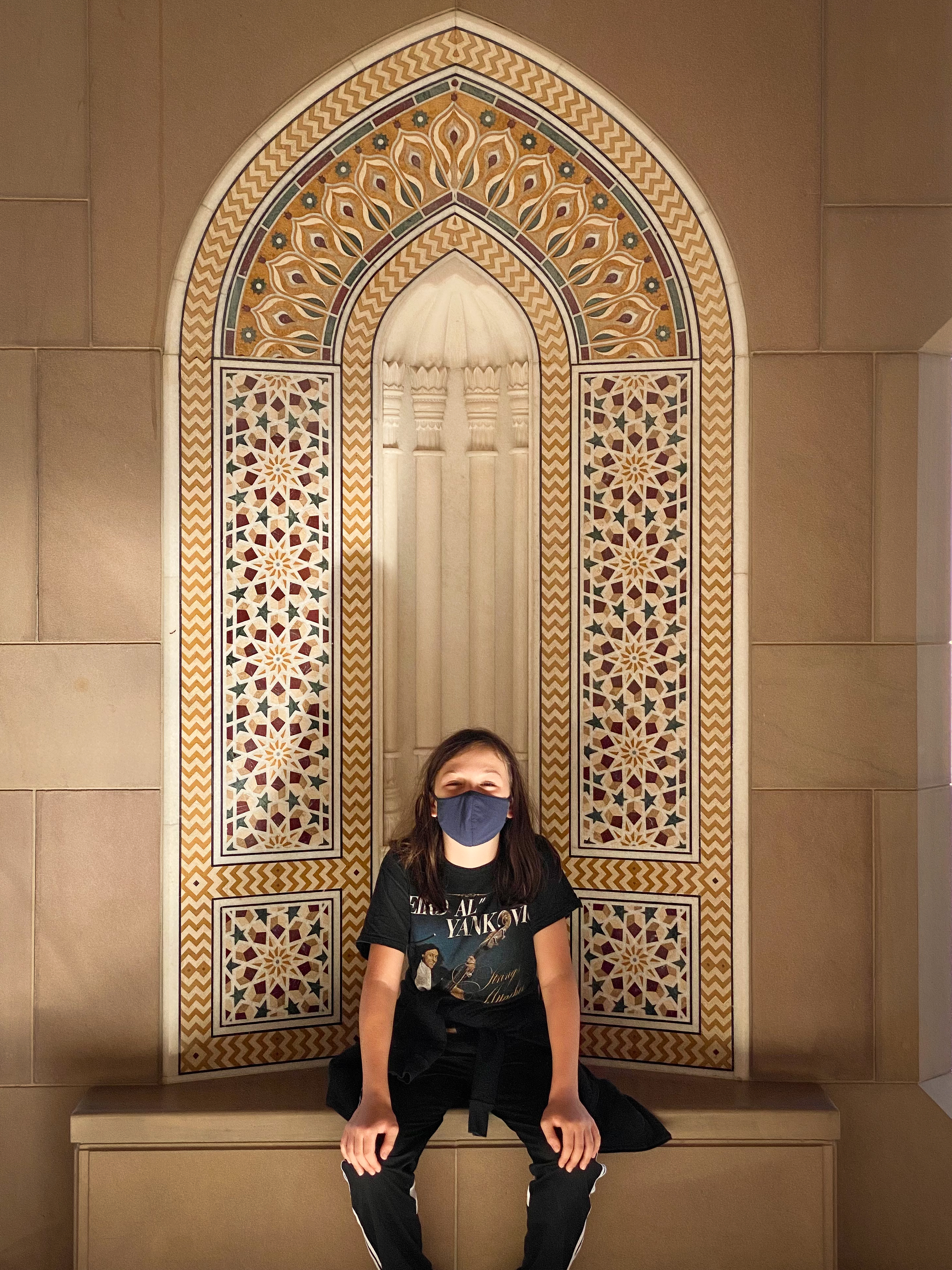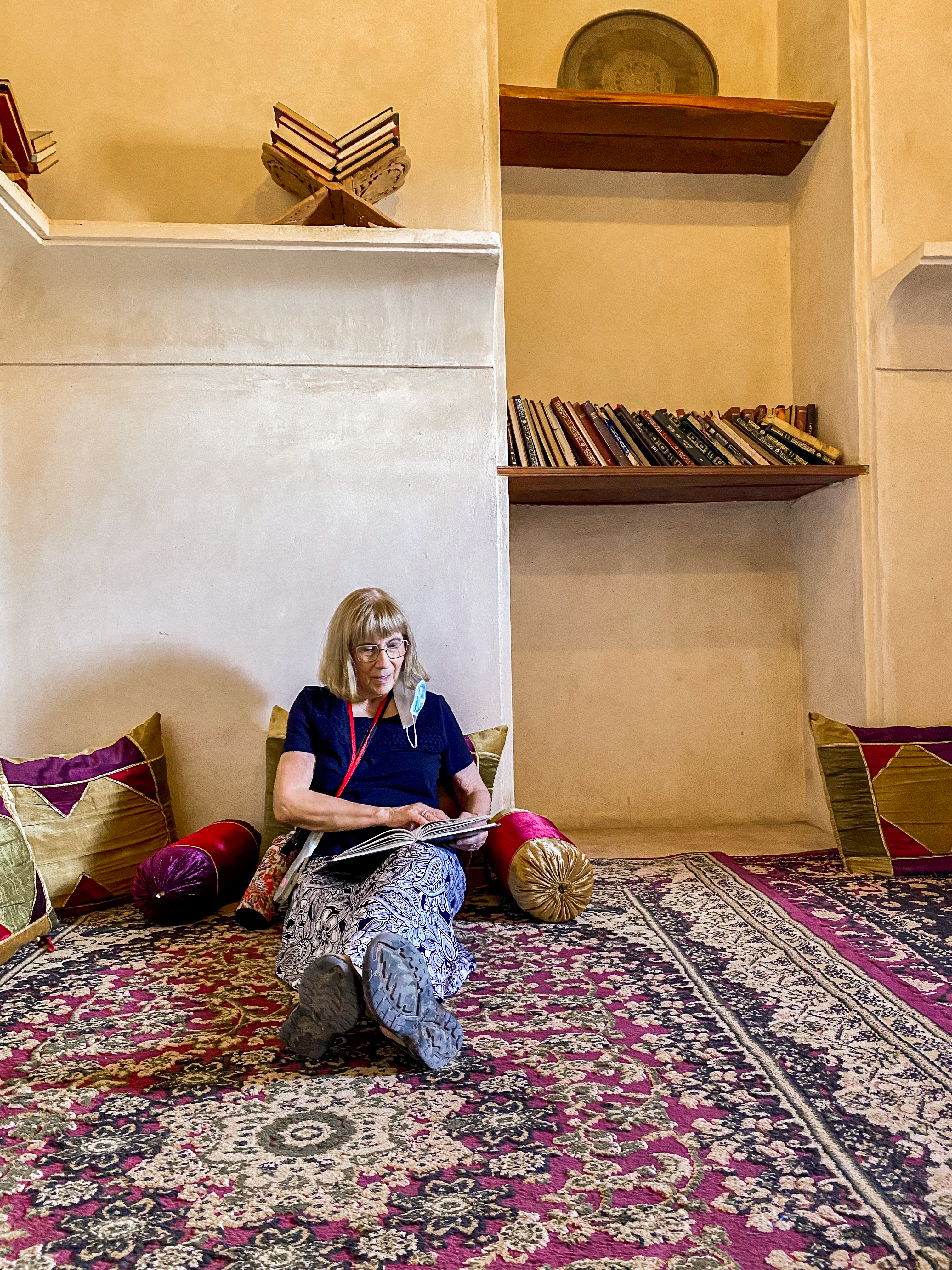 After the fort, we wandered around Jabreen castle, exploring all the nooks and crannies of this impressive structure which was built in 1675 by Imam Bil-Arab Bin Sultan. The castle included towers, a burial chamber, kitchen and dining areas, a court room, a library, classrooms, and reception rooms including the Sun and Moon room where the Imam would entertain his most important guests. There was also a “whispering room” where top-secret information was shared on a need-to-know basis. Mila enjoyed crawling into the women’s prison cells and my mom and Mila enjoyed crawling out the dedicated exit of the courtroom for the guilty, requiring anyone passing that way to stoop in shame.