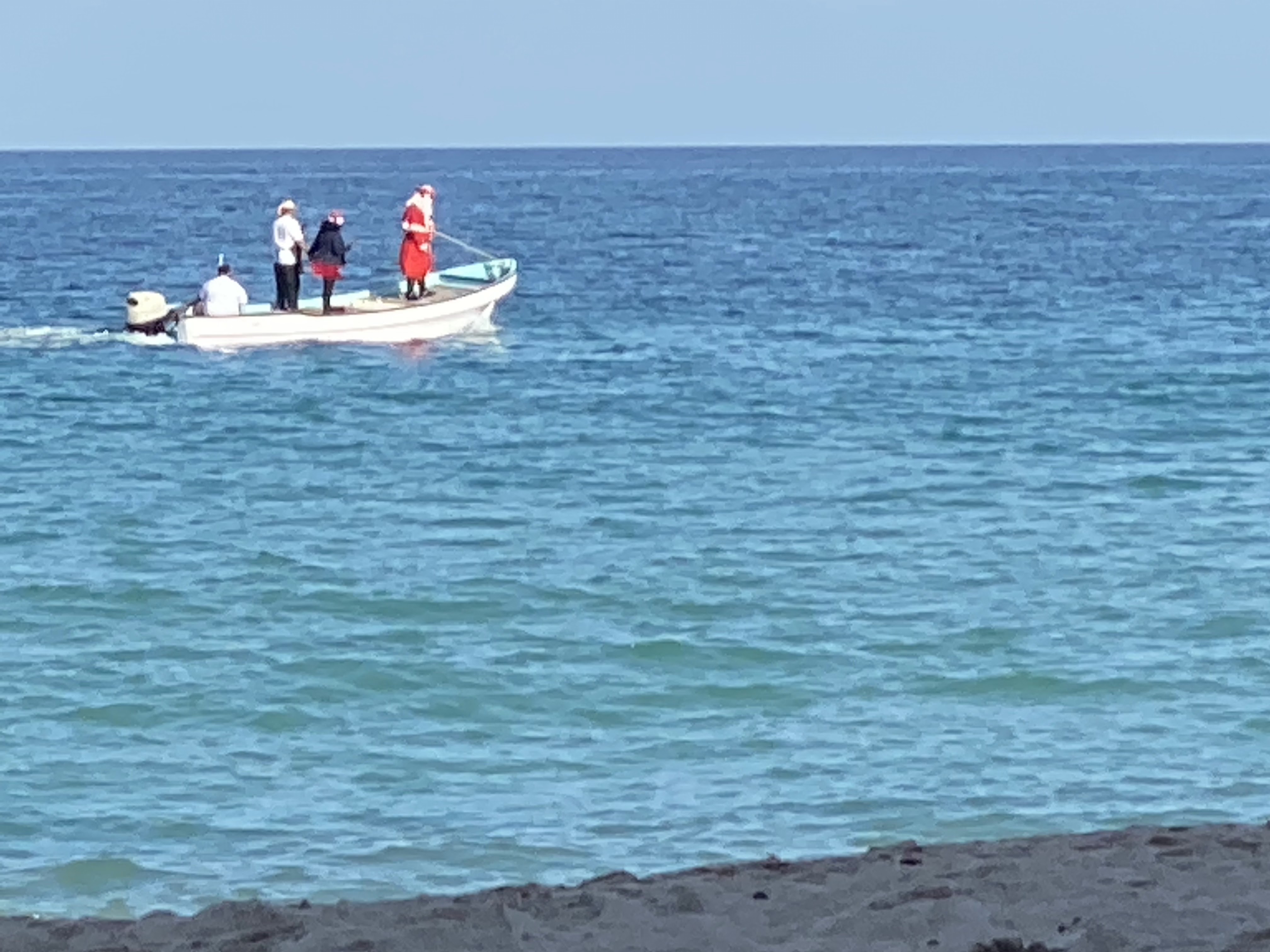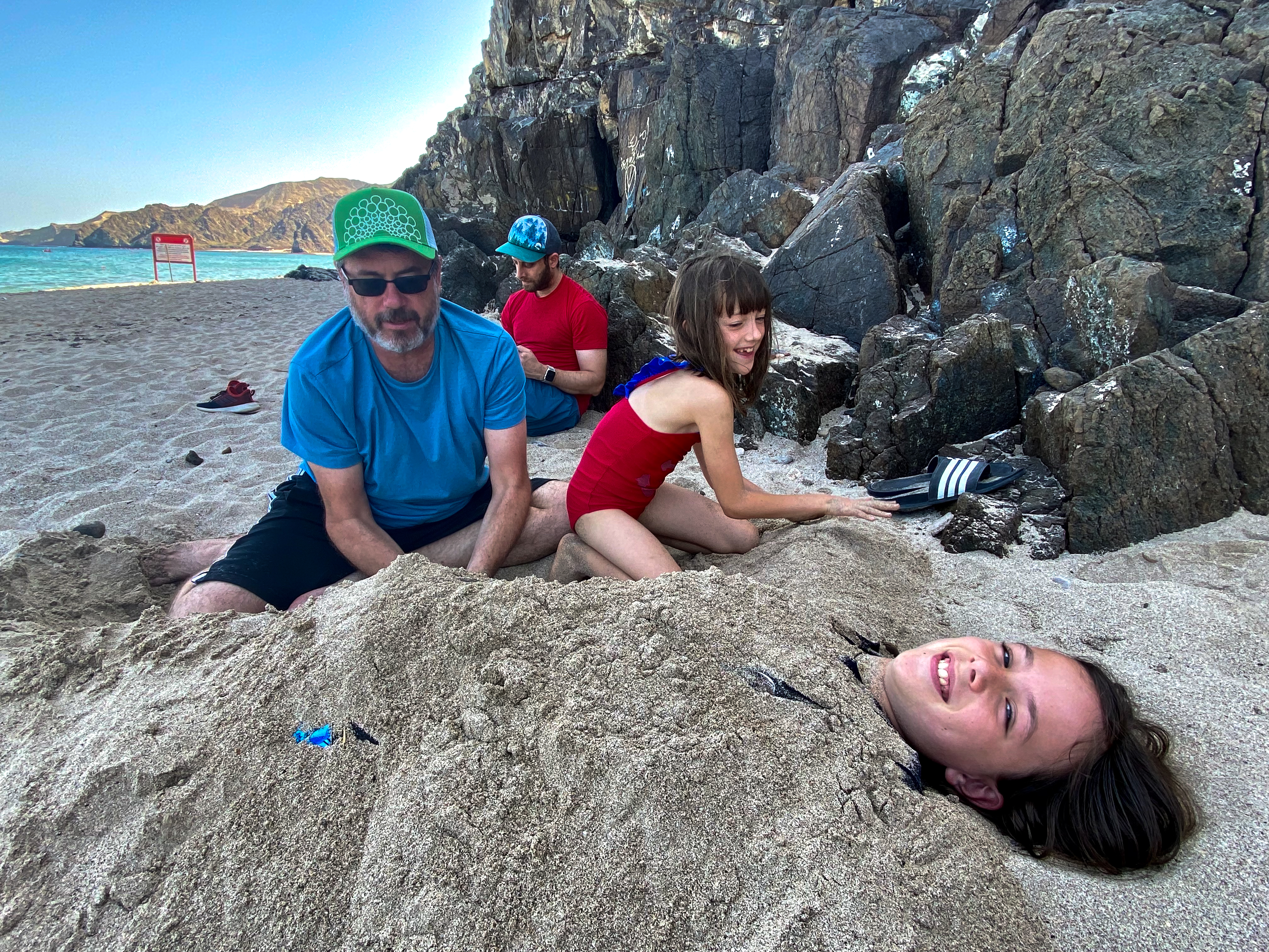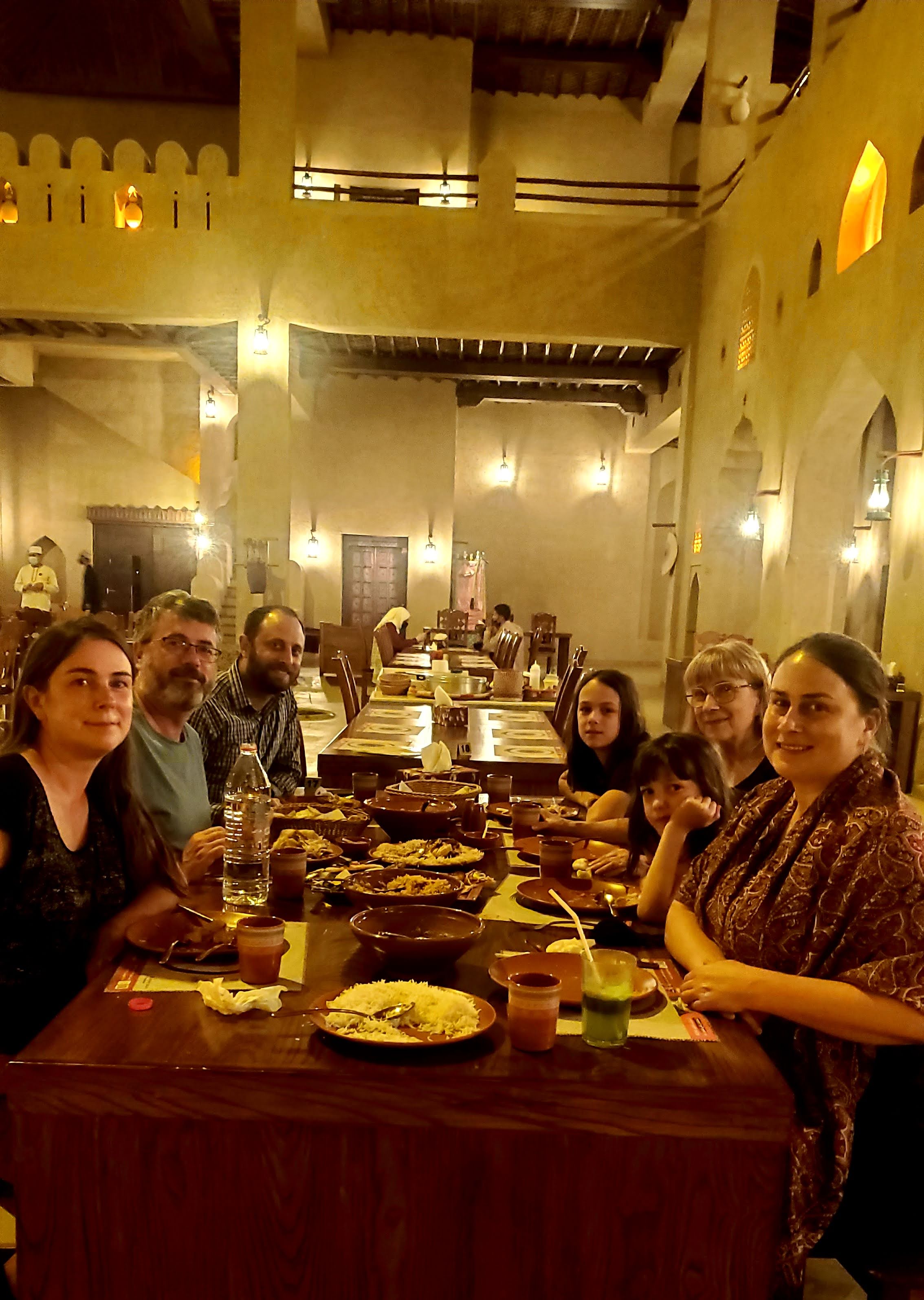 After our mosque visit, we headed to the beach where we spent a lazy afternoon. We collected shells, buried Alden and Mila in the sand, and watched birds have a lunchtime snack of two squids who had washed ashore. Emily found a red Christmas ornament on the rocks and we waved to Santa as he cruised by in a boat. We enjoyed an Omani feast for our Christmas dinner at a restaurant inside a huge fort-like building a late-night flight back to Abu Dhabi.