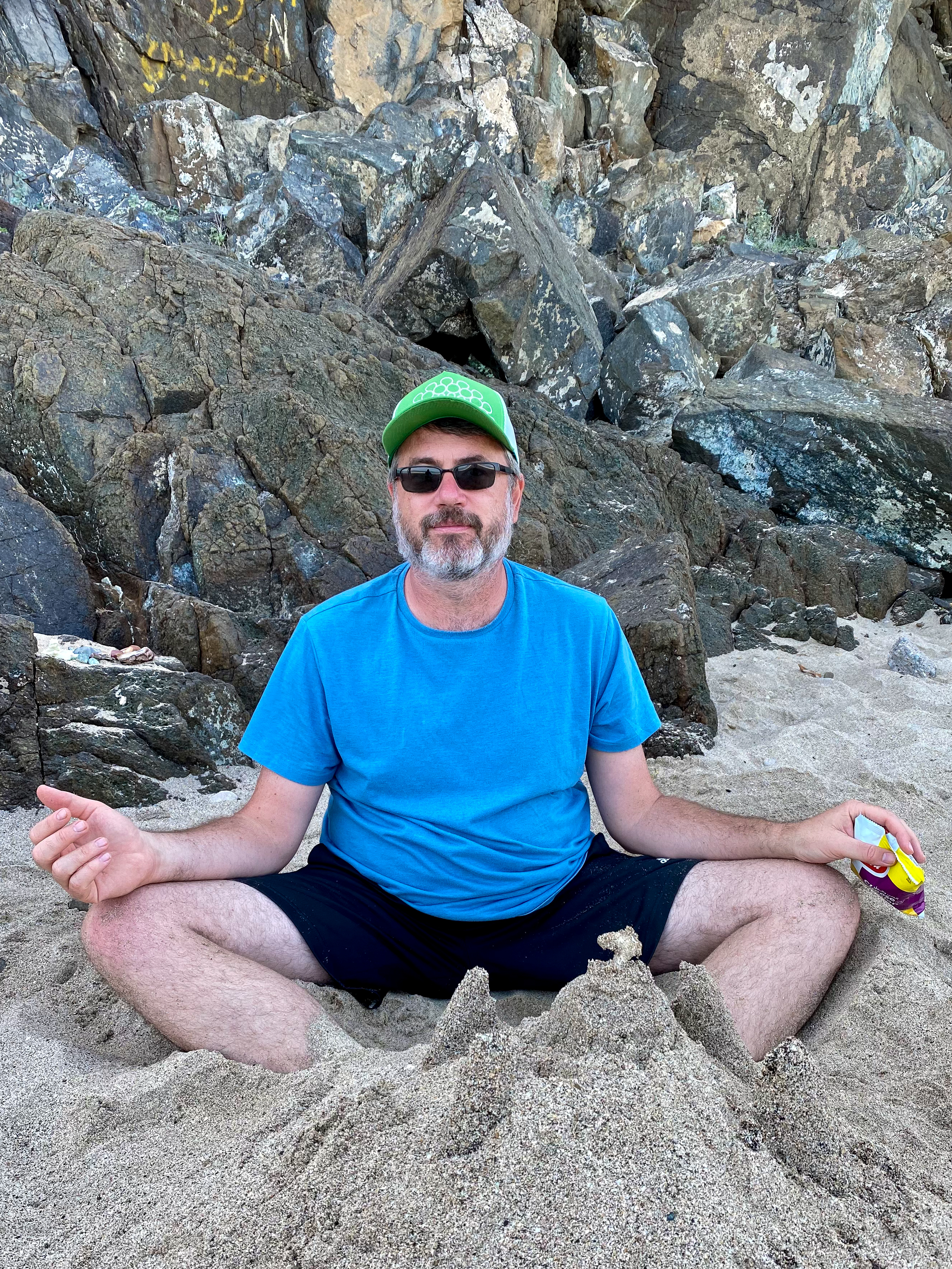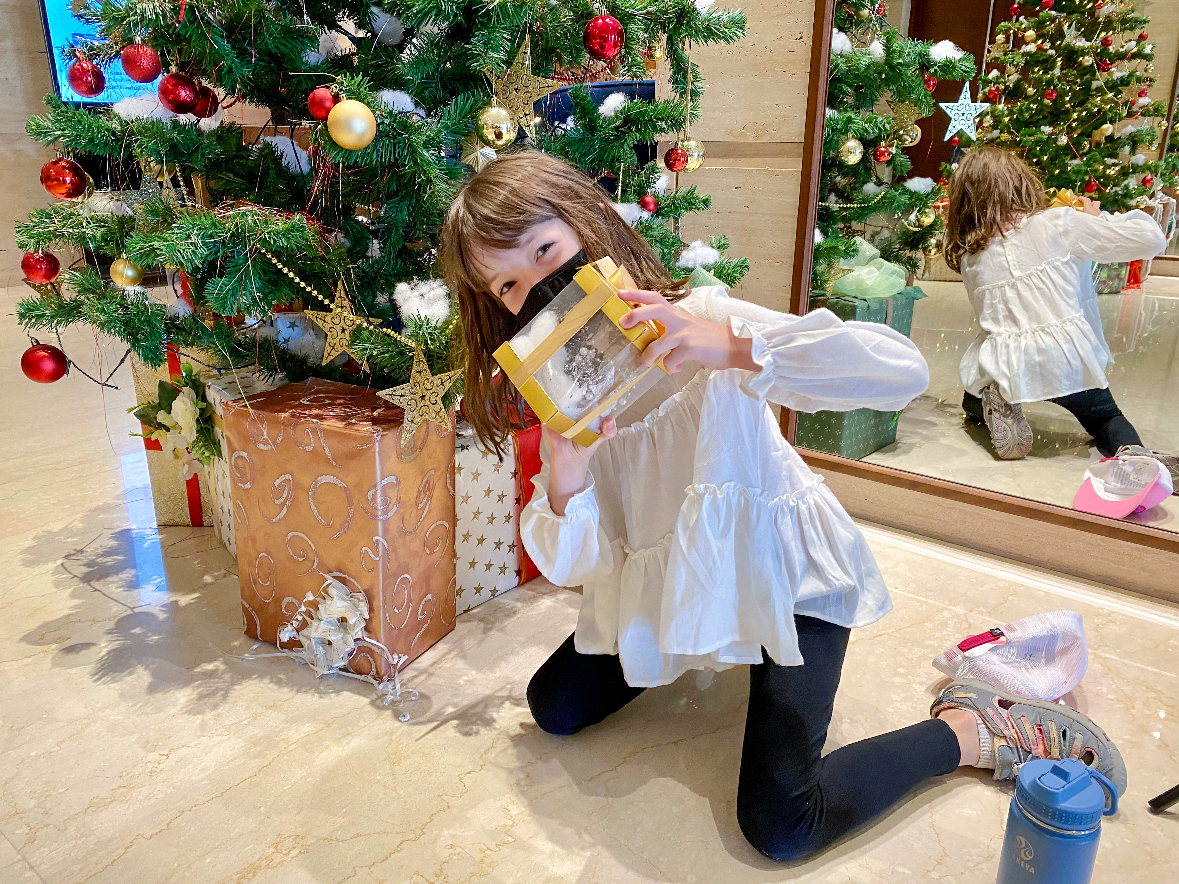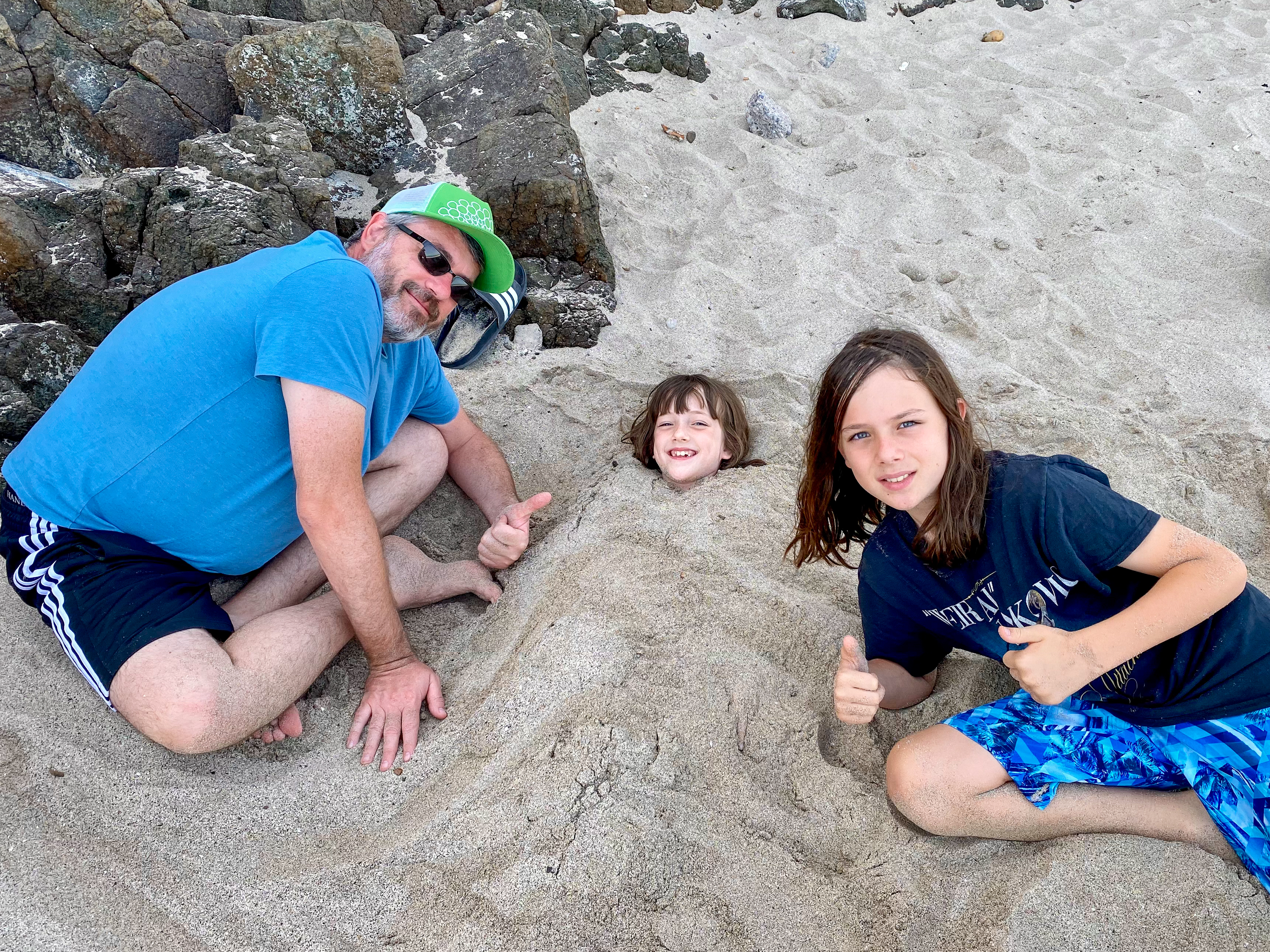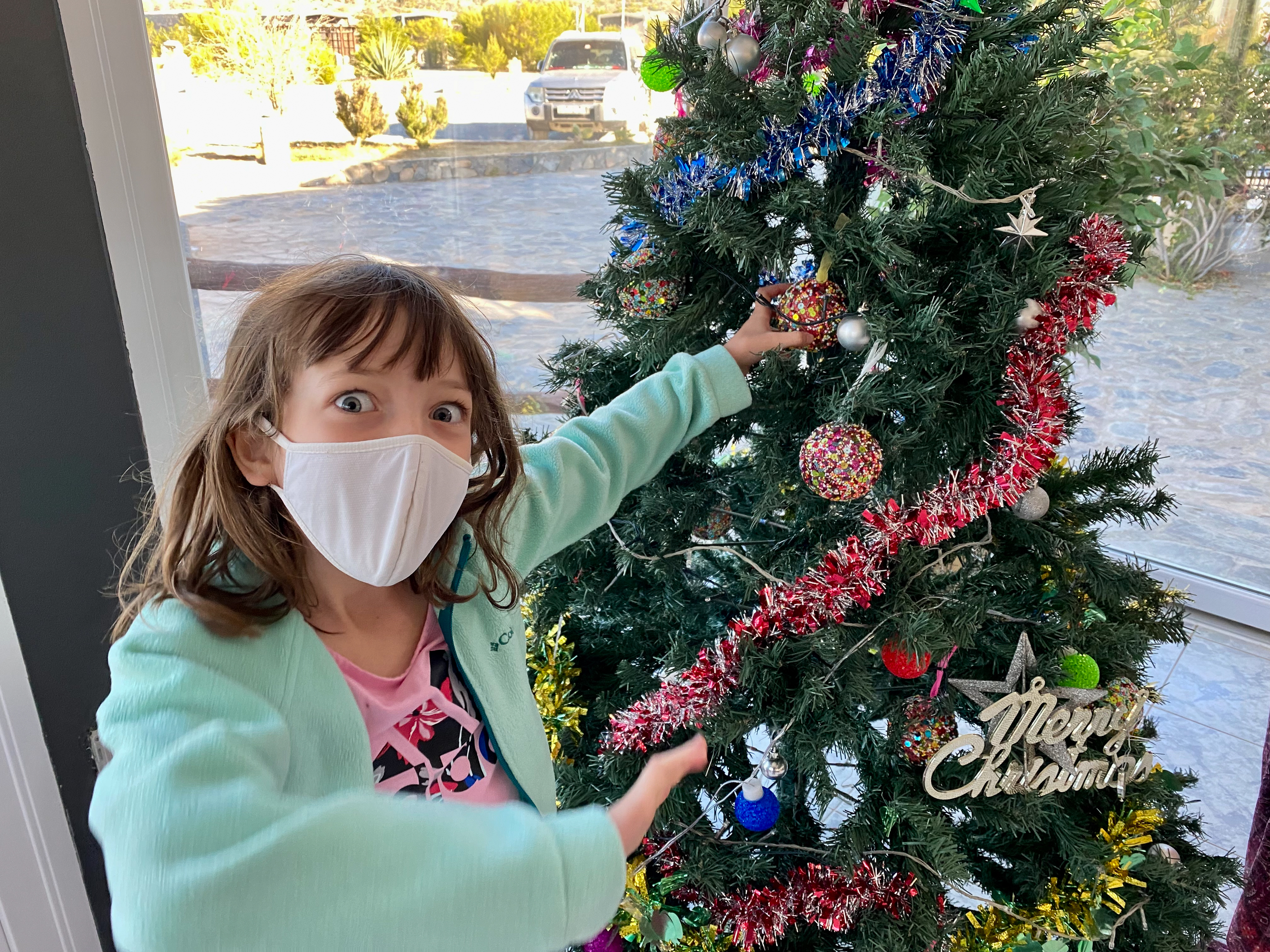 After our mosque visit, we headed to the beach where we spent a lazy afternoon. We collected shells, buried Alden and Mila in the sand, and watched birds have a lunchtime snack of two squids who had washed ashore. Emily found a red Christmas ornament on the rocks and we waved to Santa as he cruised by in a boat. We enjoyed an Omani feast for our Christmas dinner at a restaurant inside a huge fort-like building a late-night flight back to Abu Dhabi.