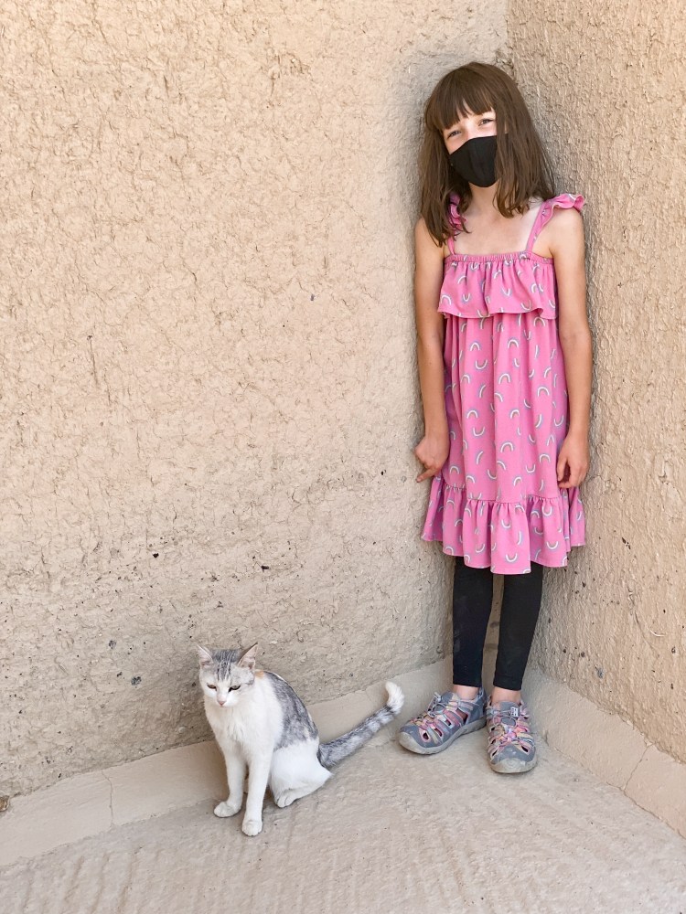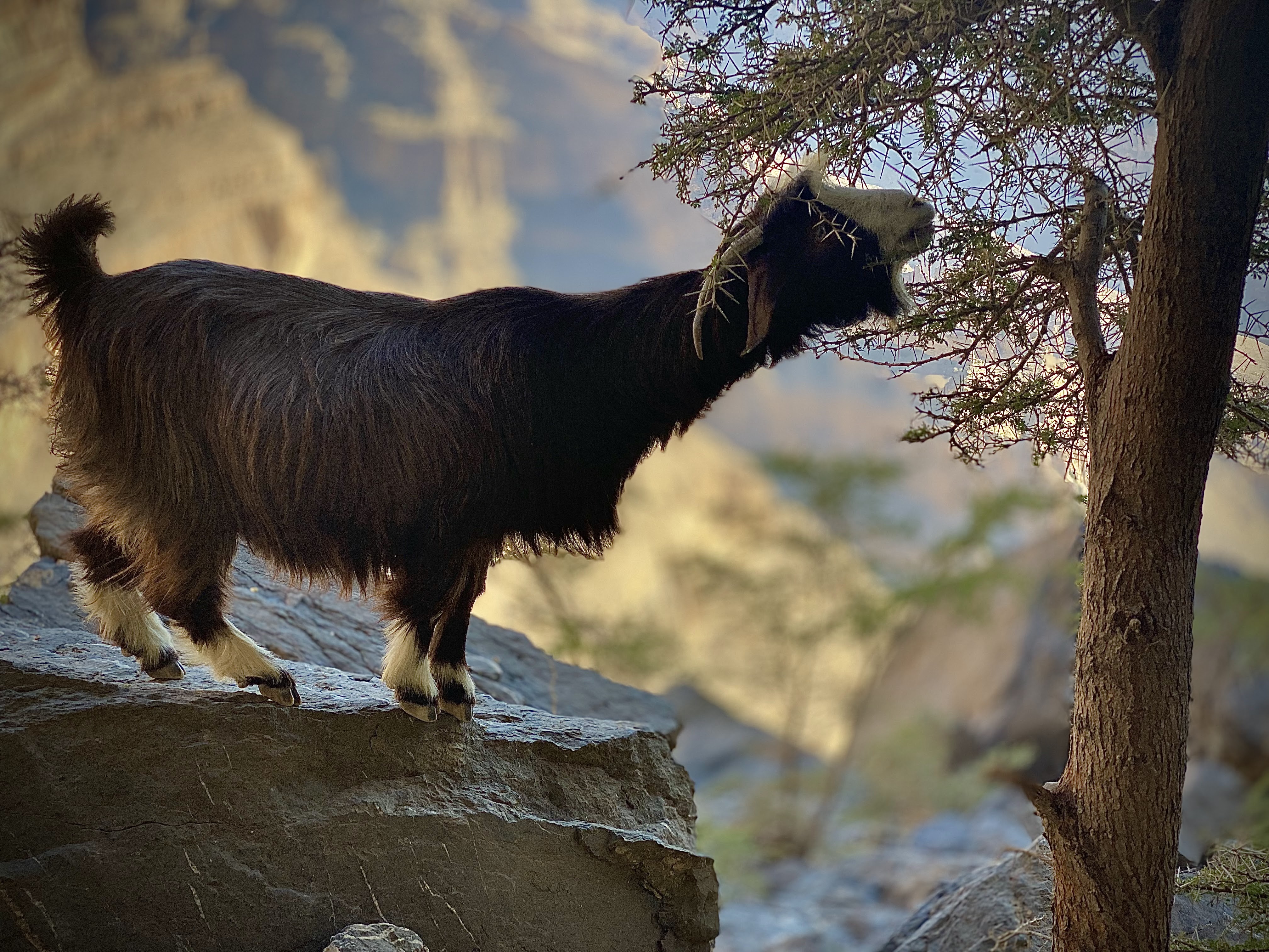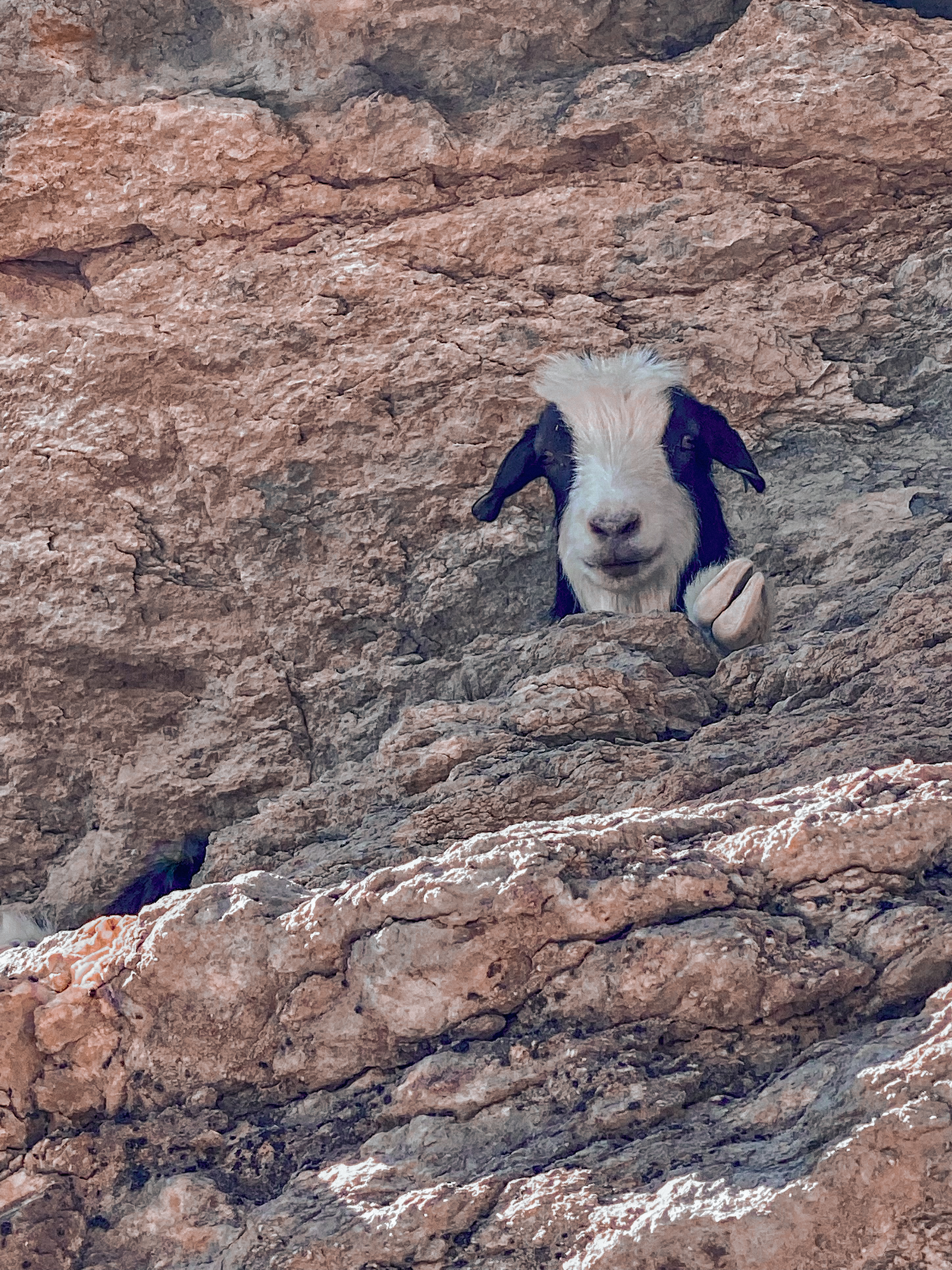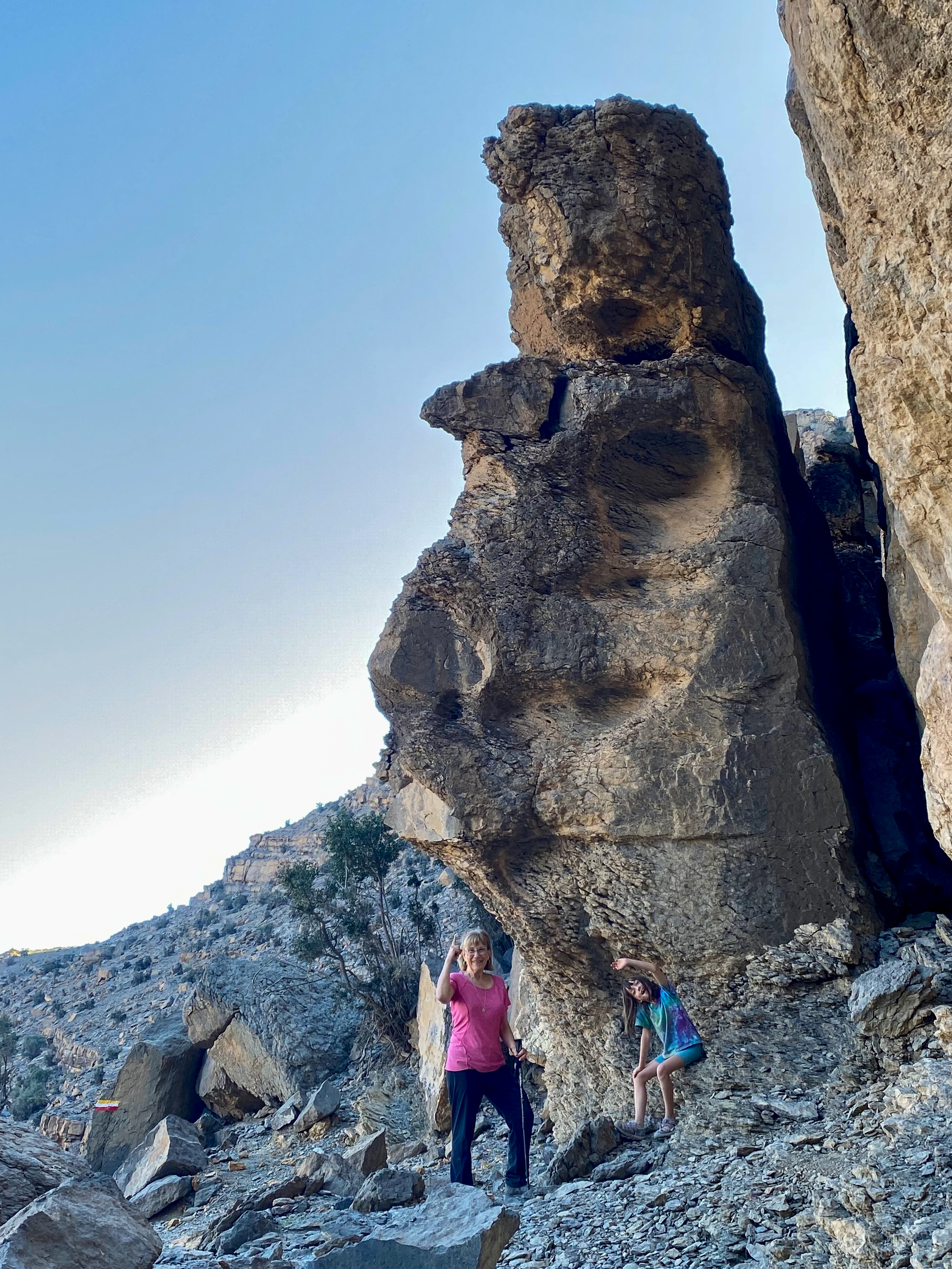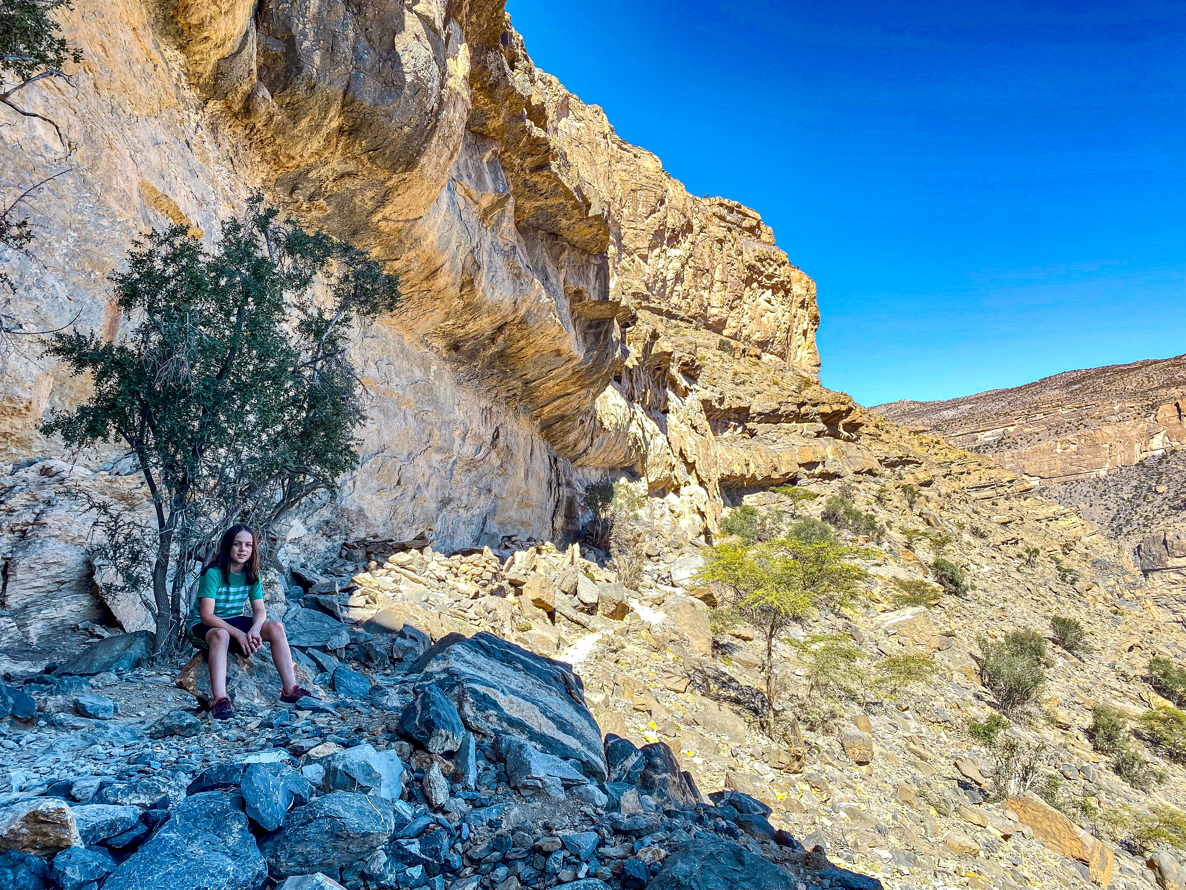 Our next adventure was up the twisty mountain road to Jebel Shams, Oman’s highest peak. Here we did an amazing hike called the “Balcony Walk” with impressive views of Wadi Ghul and Al Nakhr Canyon. In addition to the view, we loved our goat companions along the trail, three of which Mila named- Hairy Joe, Harriet Jeanette, and Hairy Potter. At the end of the trail, Emily, my mom, and I relaxed and took in the views while the boys and Mila scrambled up to find a pool. We got back to our mountain resort just in time to watch the sunset from our back patio.
