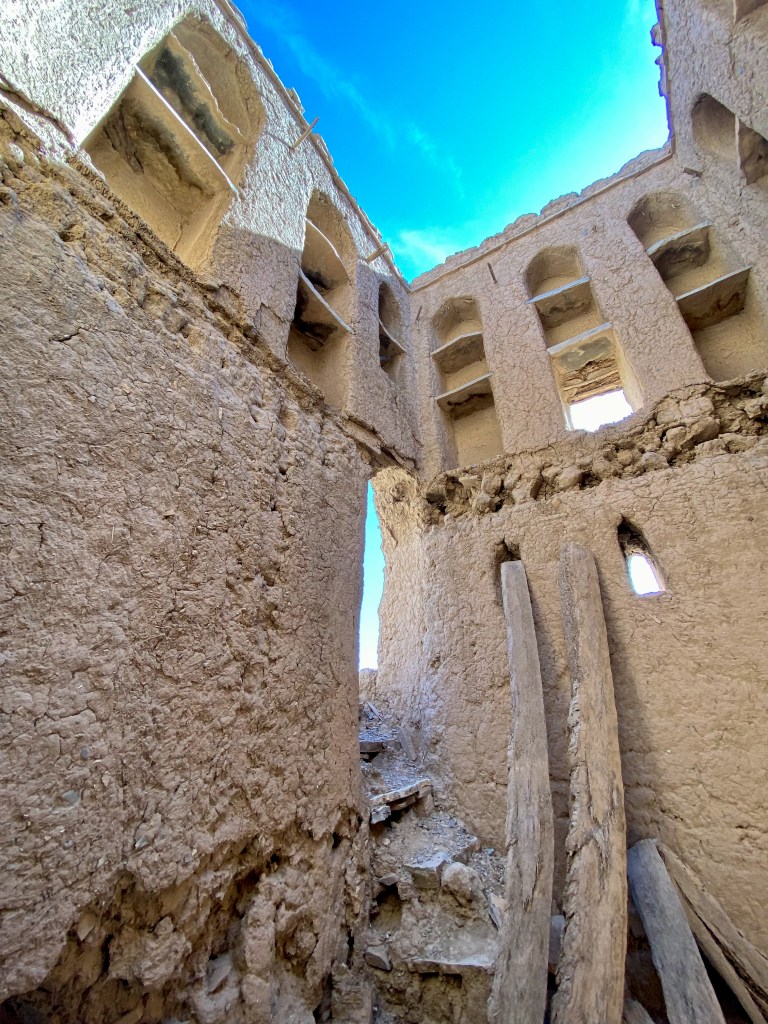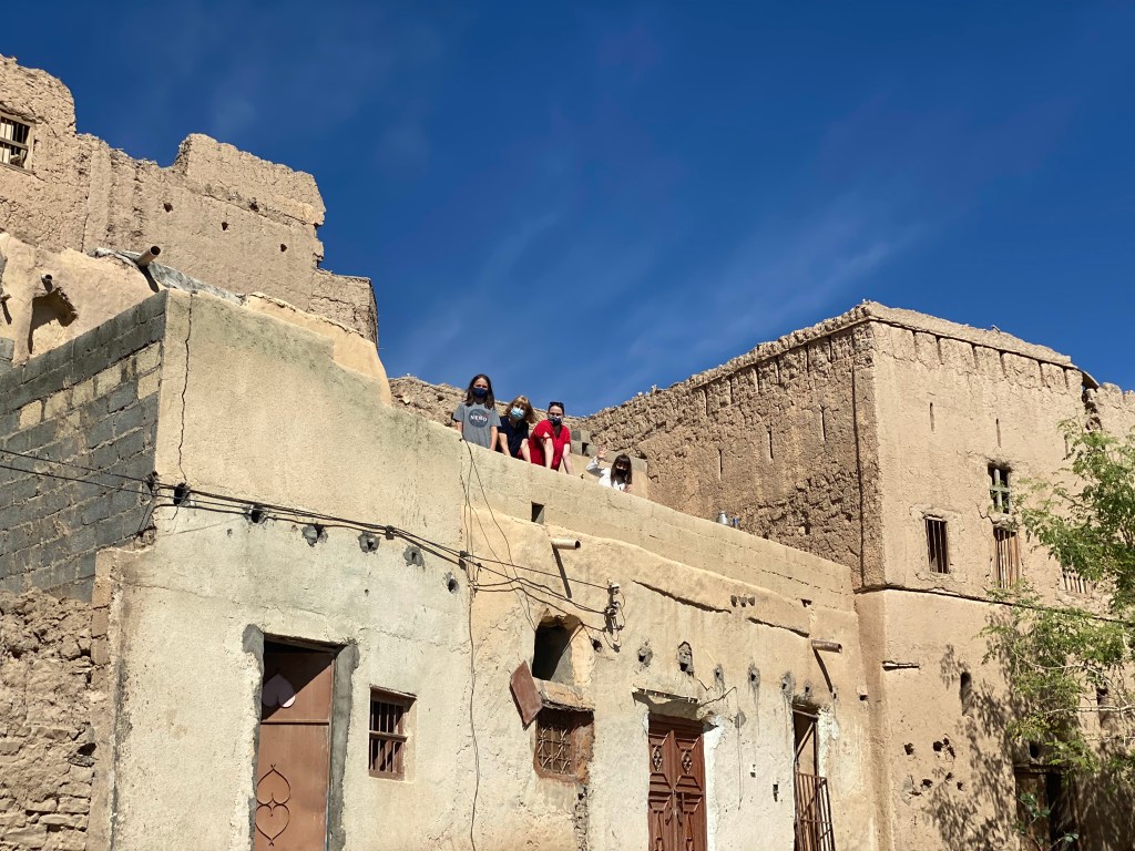 On the way to Nizwa, we stopped to explore Birkat Al Mouz. This village was abandoned in the 1950s due to war with the British. We climbed around the ruins and walked along the falaj, where we were again invited by locals for dates and coffee.
